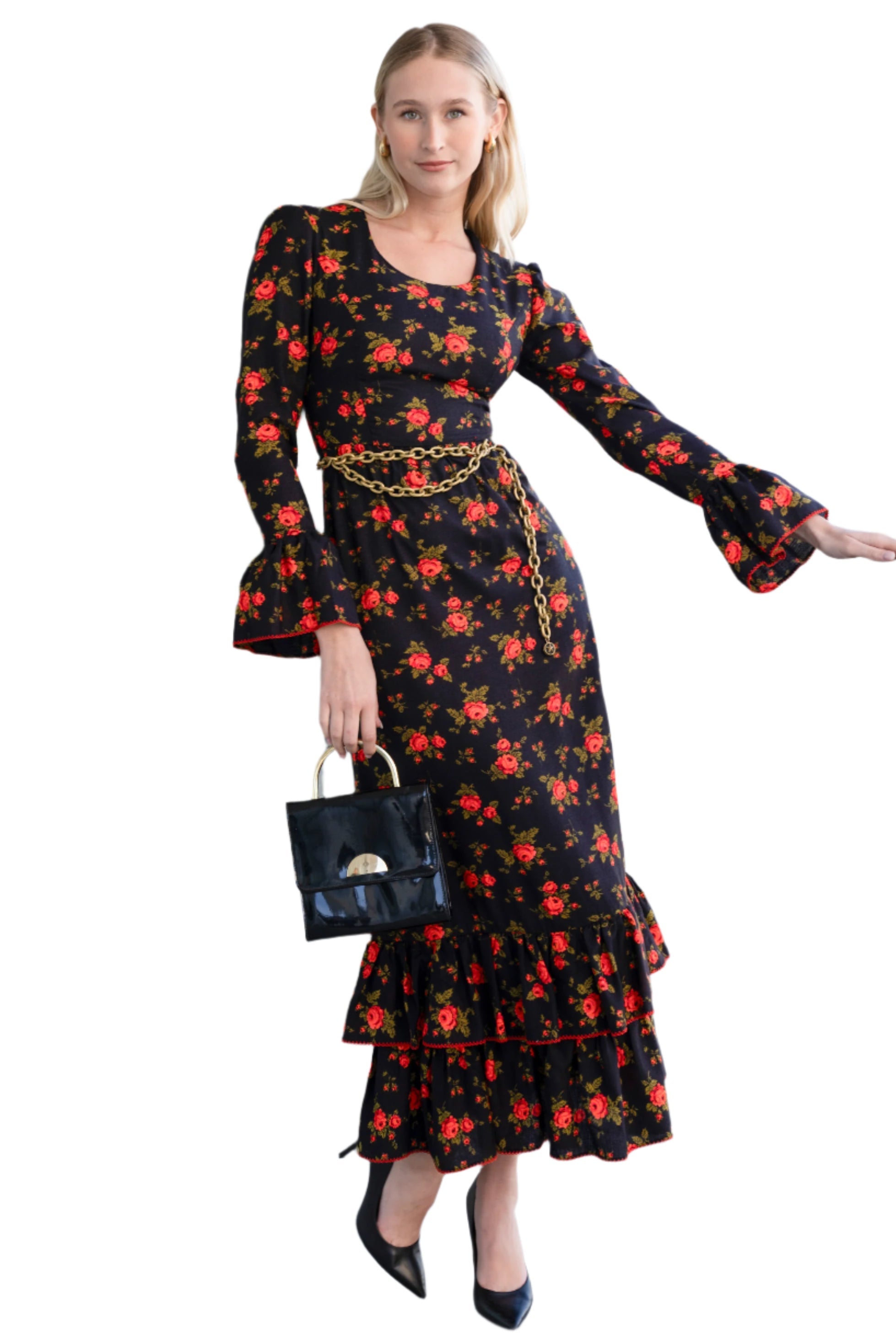 Step into style with this vintage 1960s/1970s Joseph Magnin Black Ruffle Dress in a distinct red orange rose floral print. This high waisted a-lined maxi features a double pleated ruffled bottom and long sleeves with ruffled bell wrists, all accented by brightly colored crocheted details. This figure flattering dress is complete with a nylon zipper.