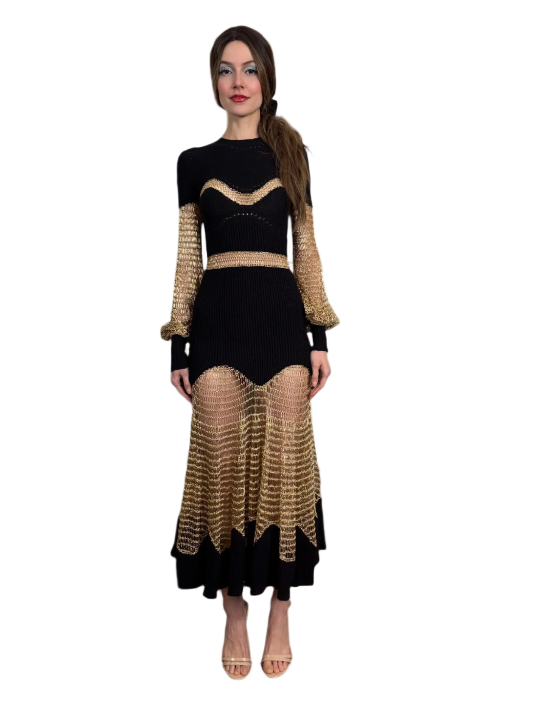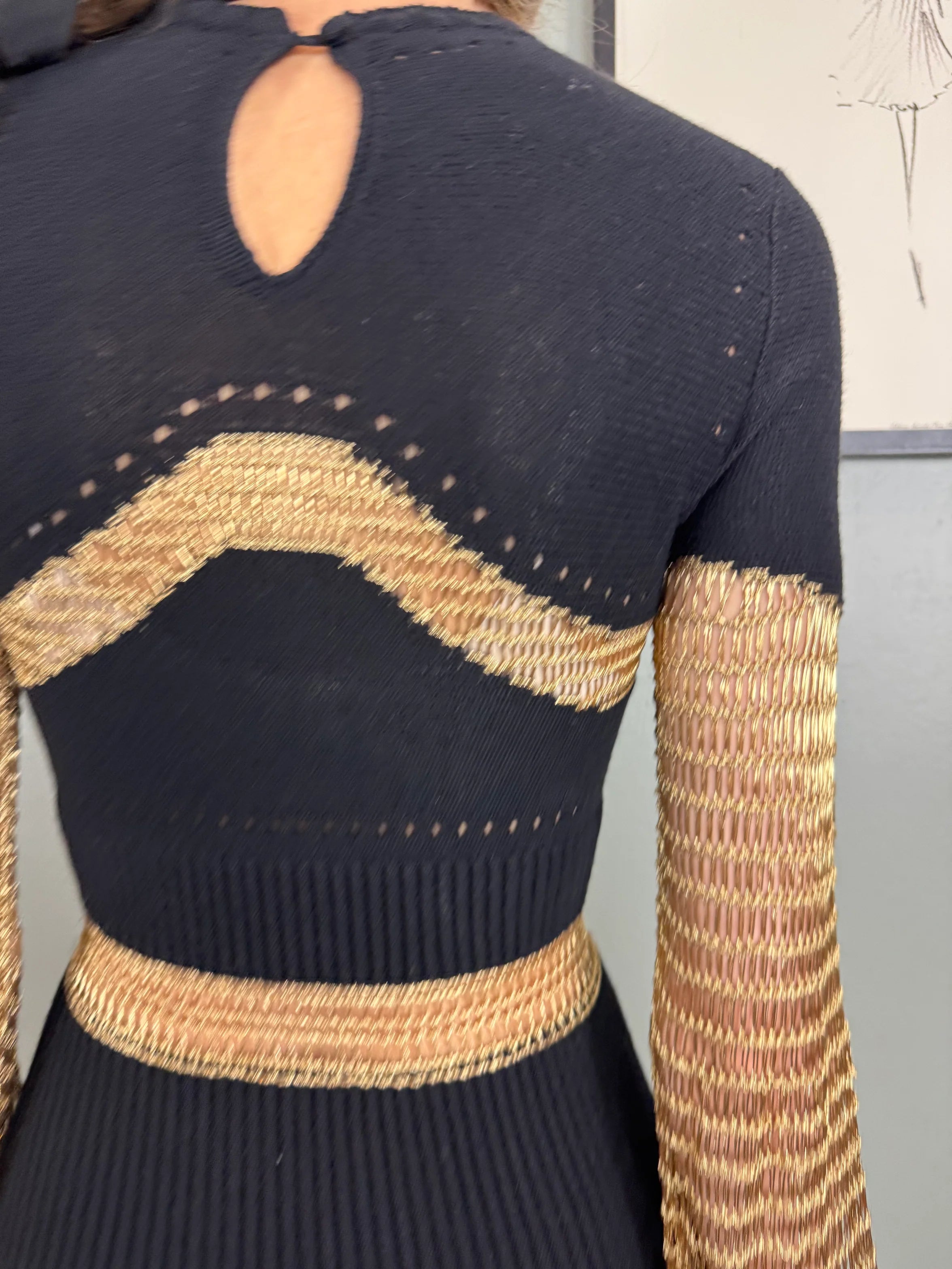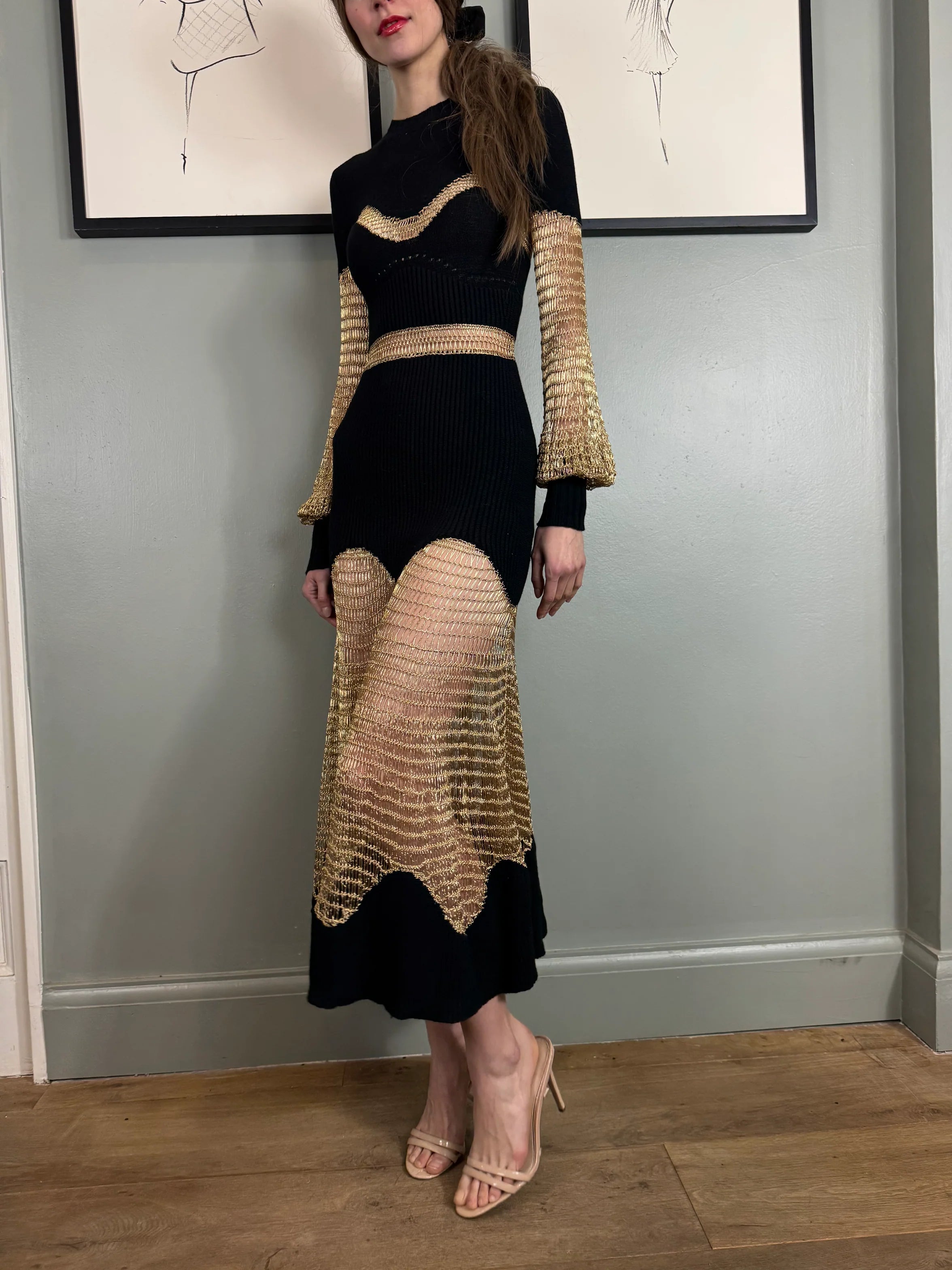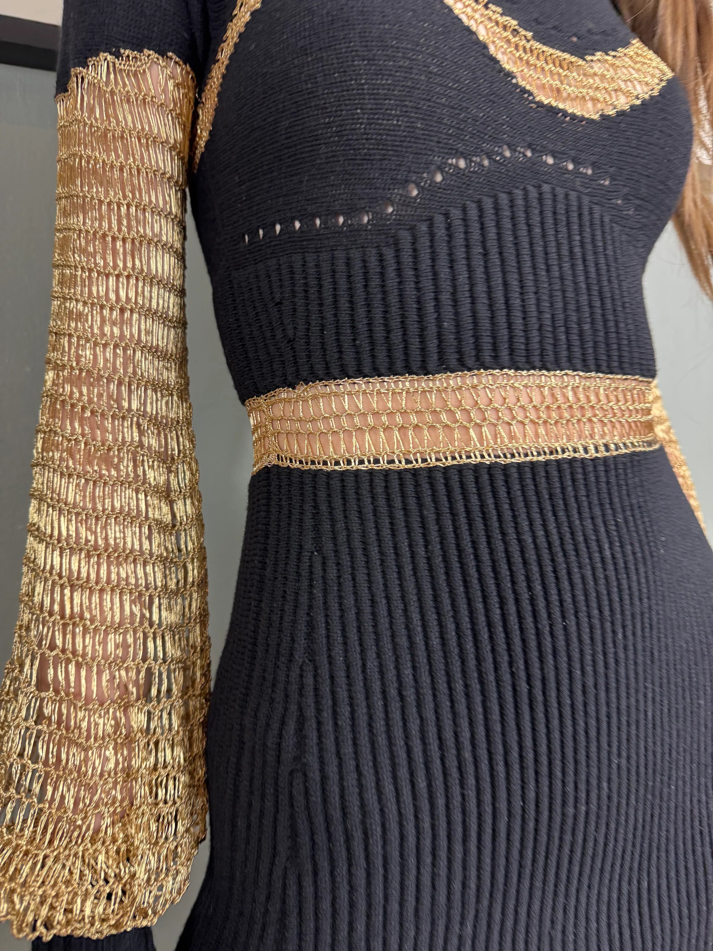 This Alexander McQueen dress is a rare and collectable piece, never worn, featuring long gold lurex crochet sleeves, waist detail, and skirt. The soft black knit fabric provides coverage while the scalloped bottom adds a unique touch. Perfect for those looking to make a statement in wearable Art.