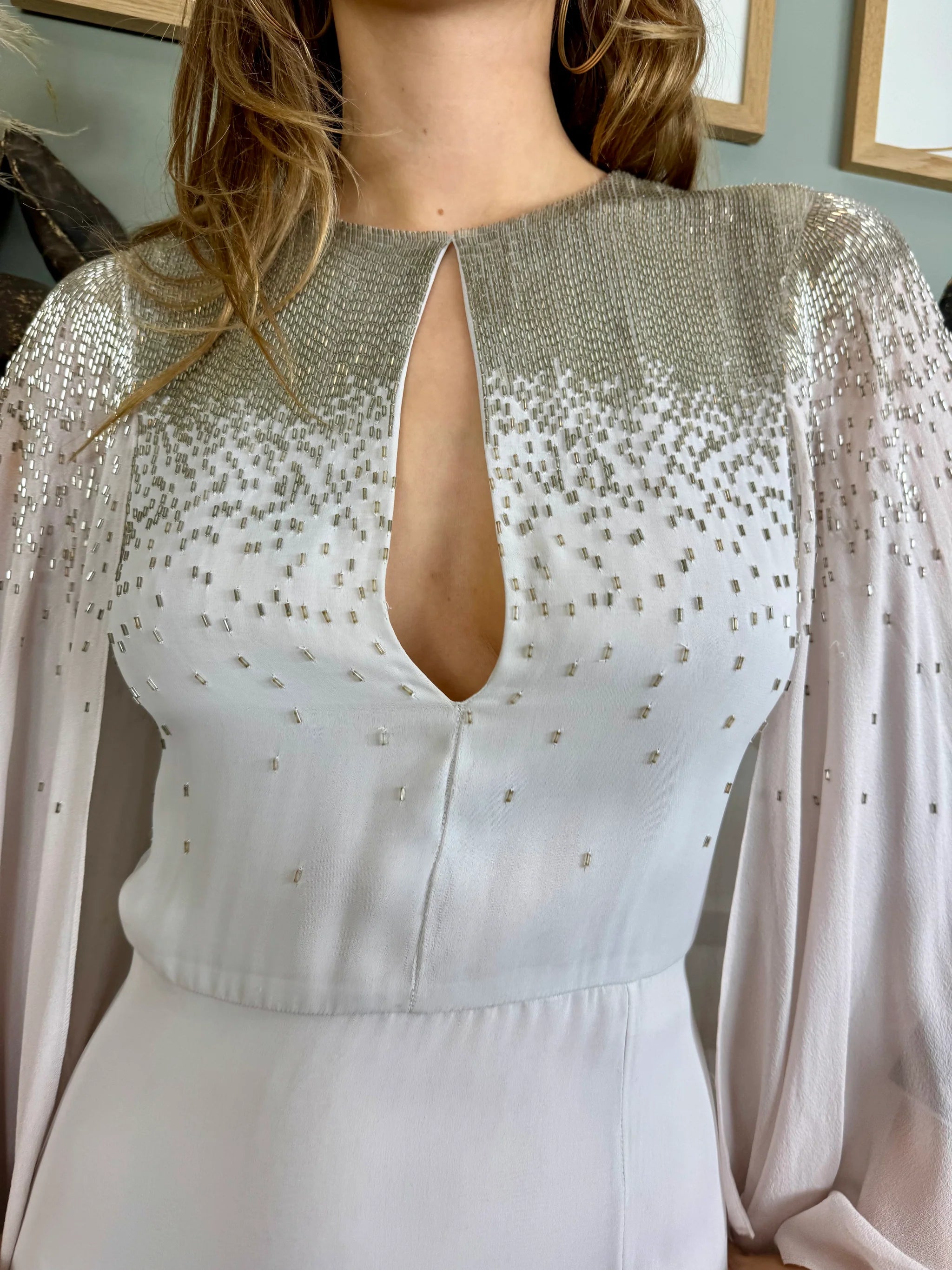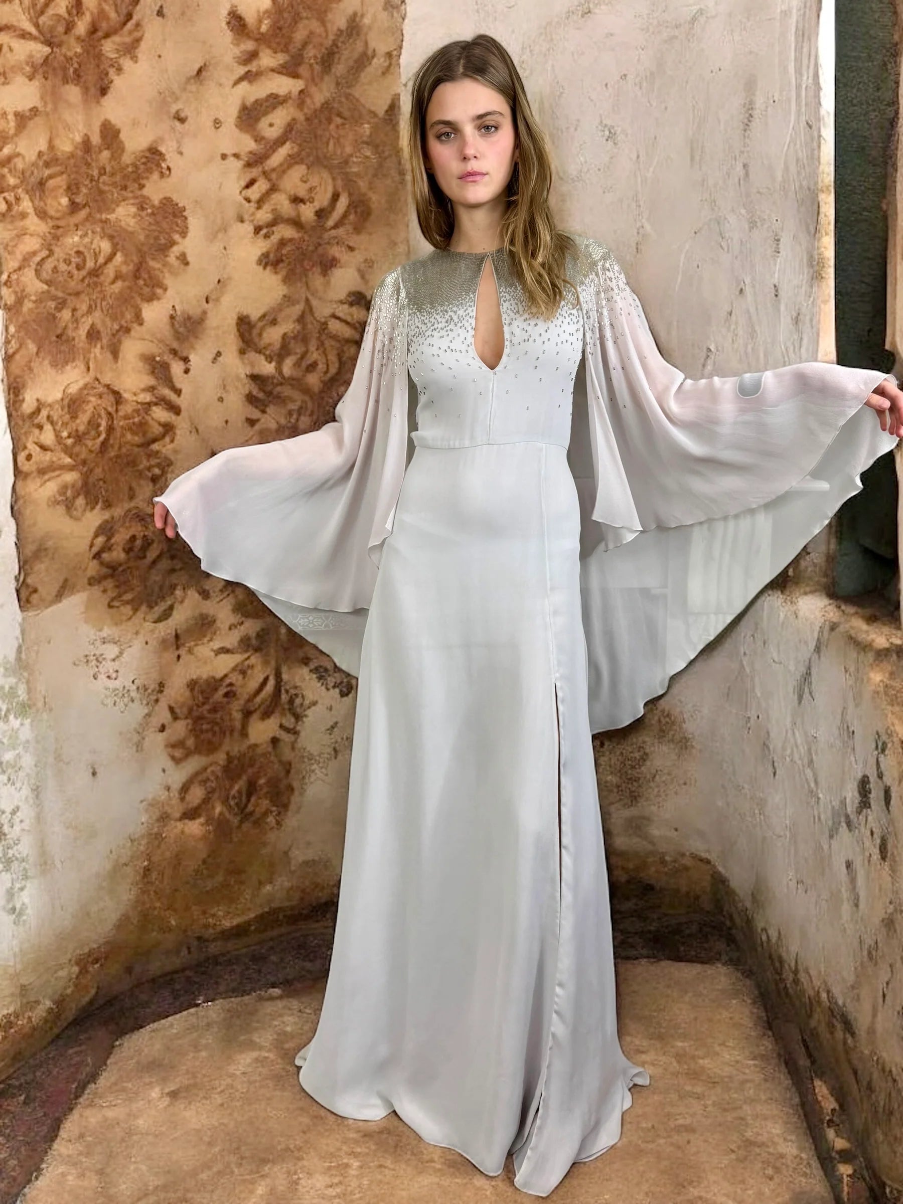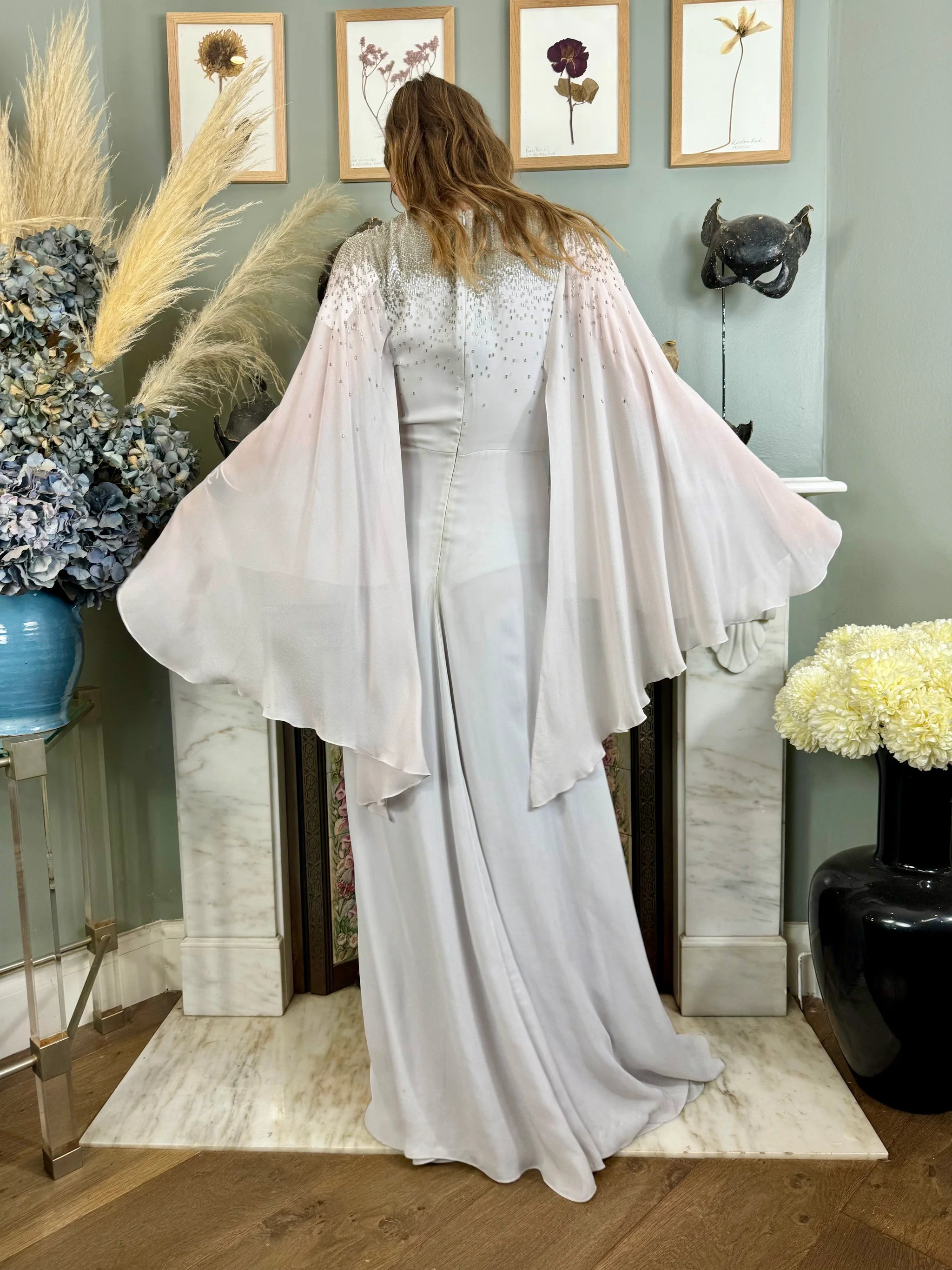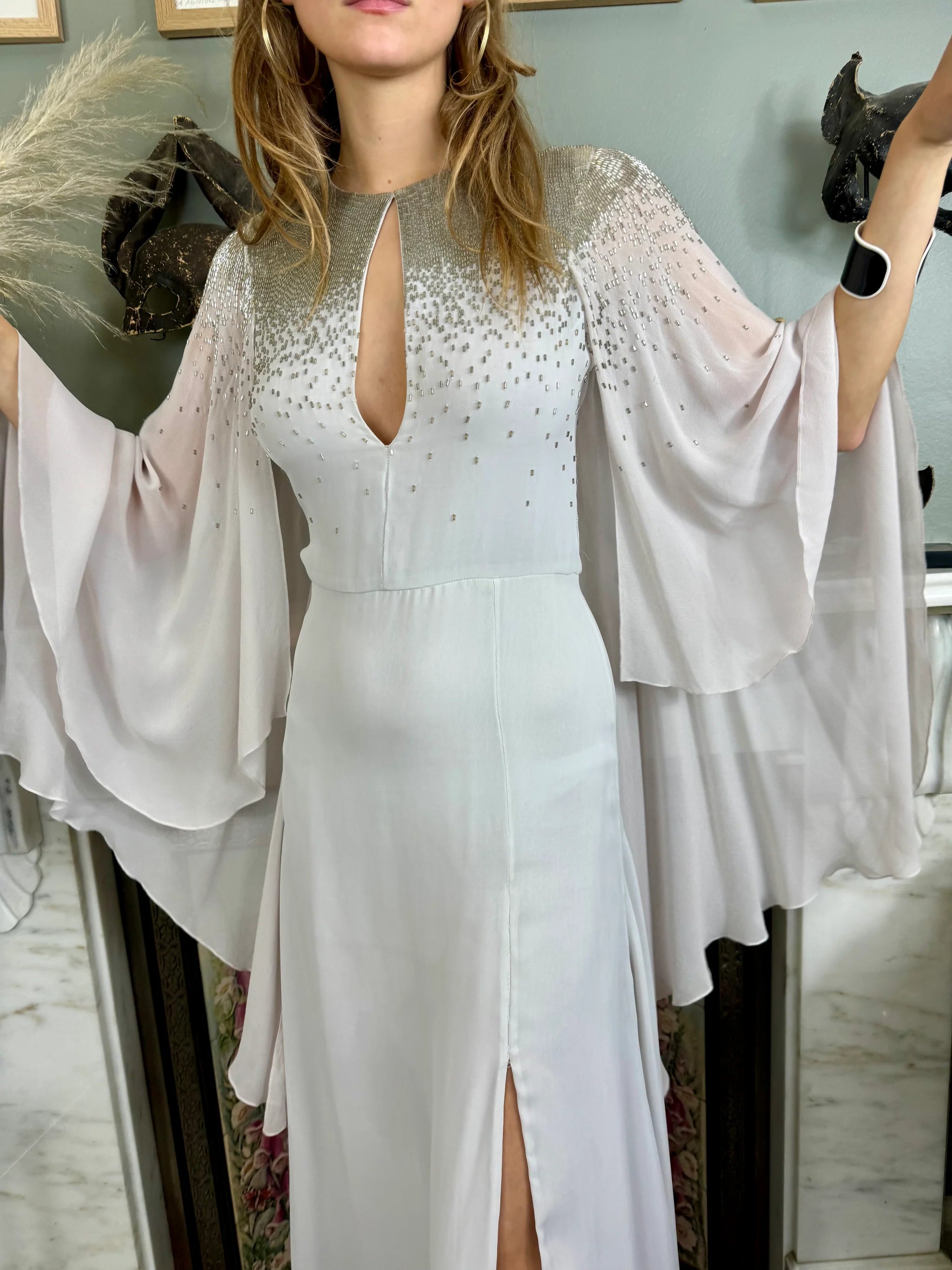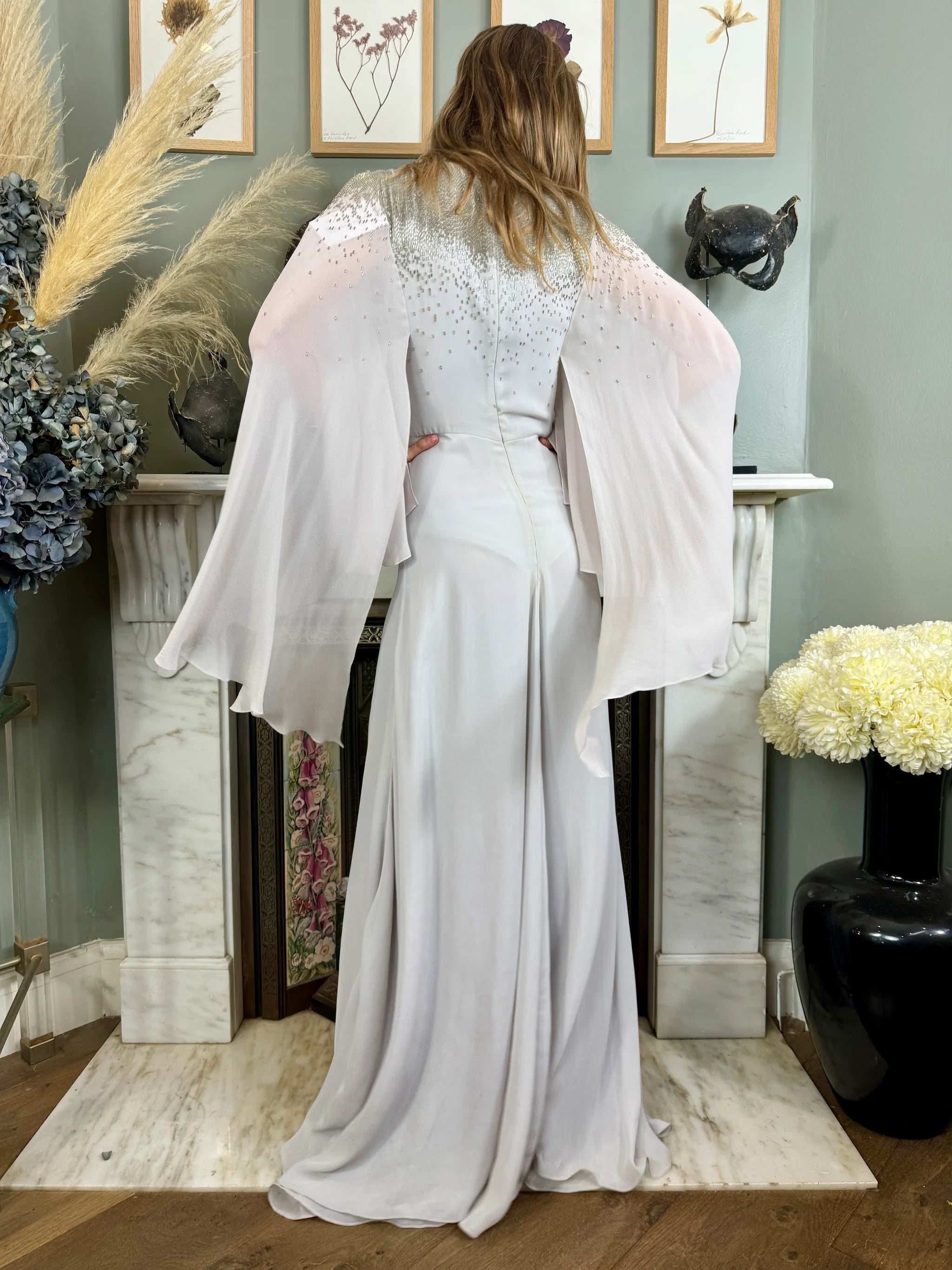 This elegant Amanda Wakely grey silk gown features a front keyhole design, loose sleeves, and a leg slit. The stunning grey beading on the chest adds a touch of glamour to this Y2K piece. Make a statement at any event with this never worn gown.