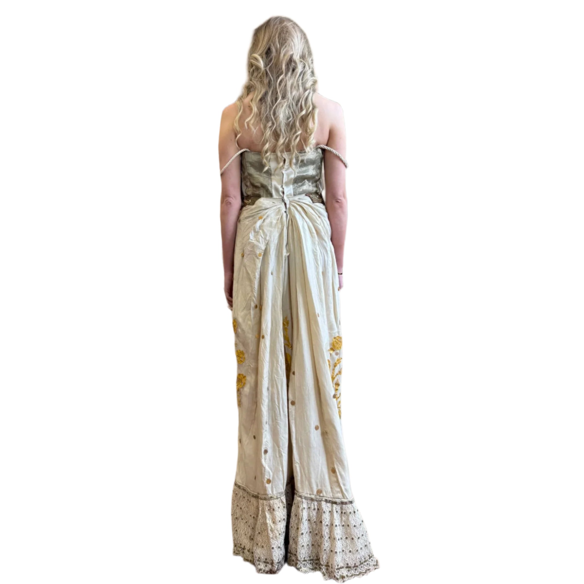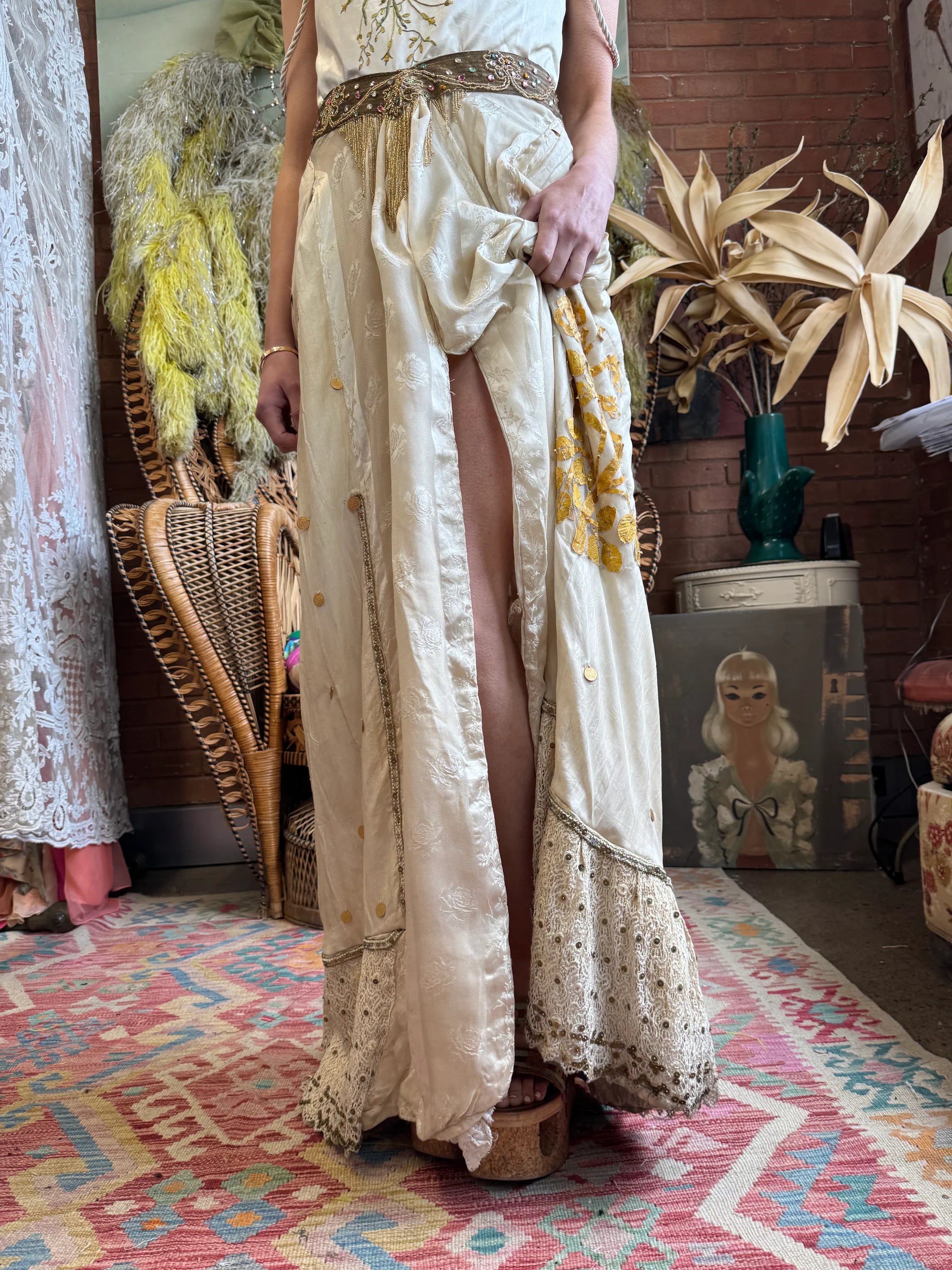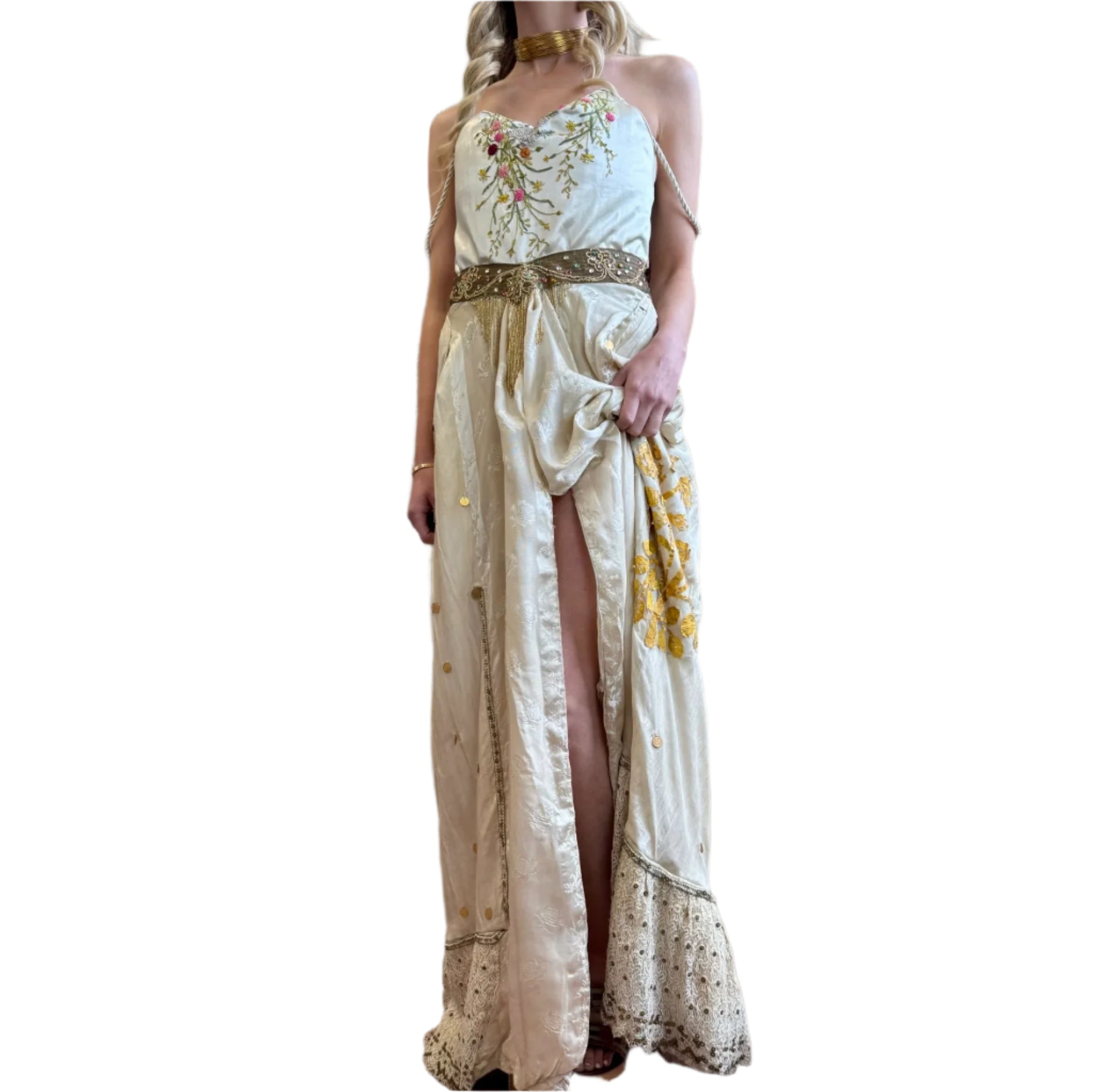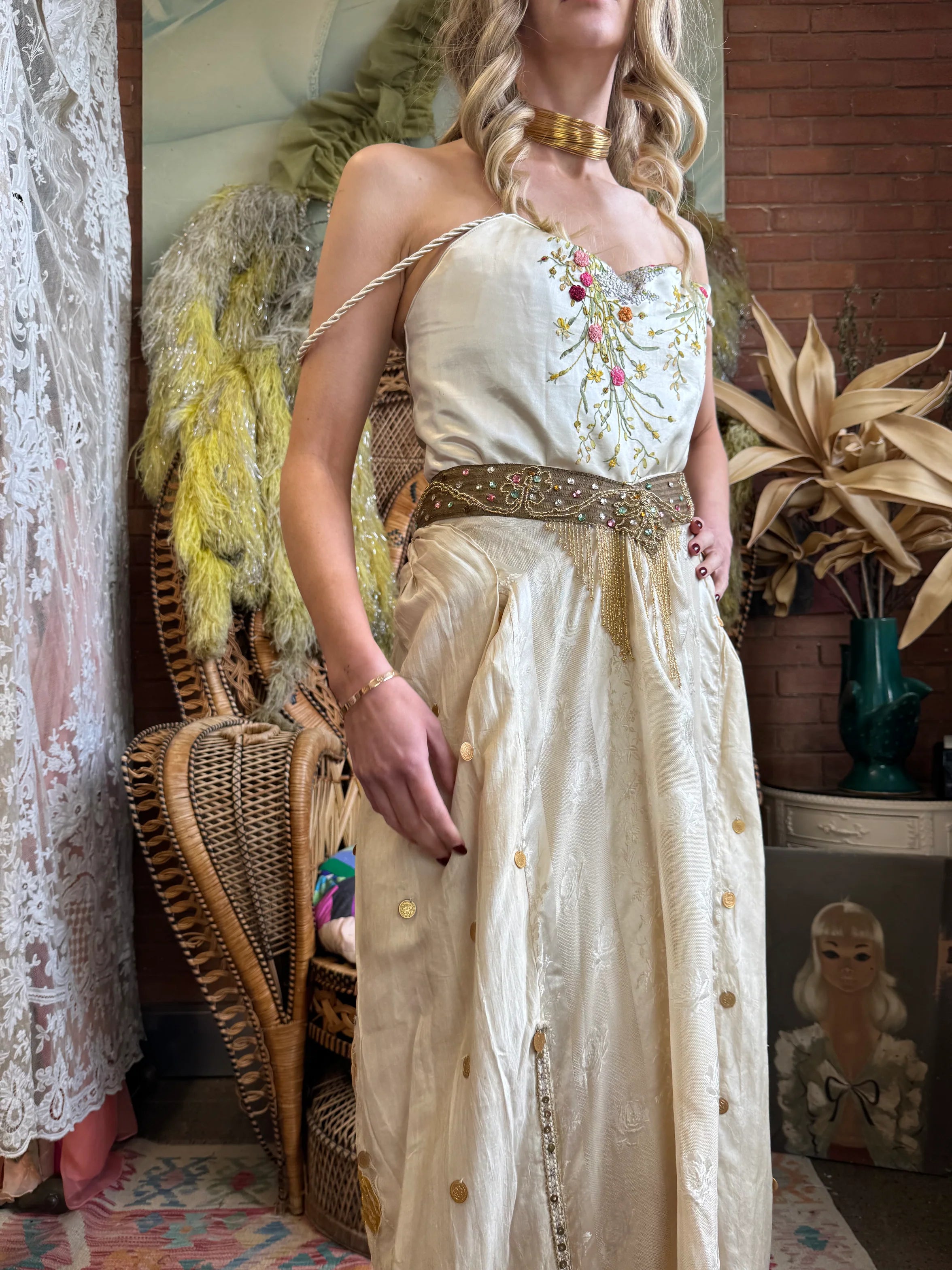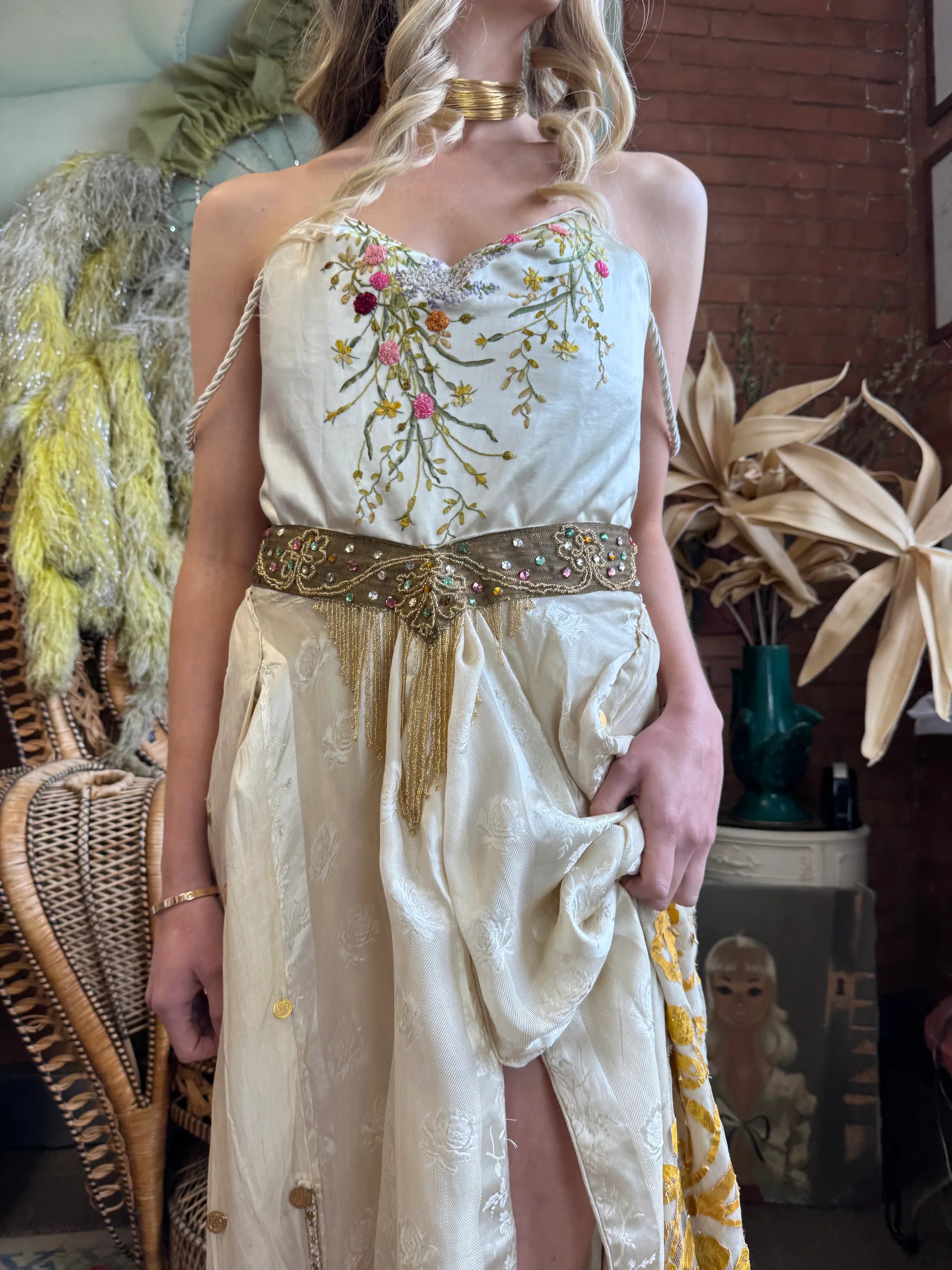 Experience true elegance and history with our 20s embroidered reworked beaded dress. This reworked original 1920s bustier dress features hand-made florals, a 20s beaded tasseled belt, and a lace and sequin hem. With a leg slit on the front and back hooks, this dress is perfect for a summer party.