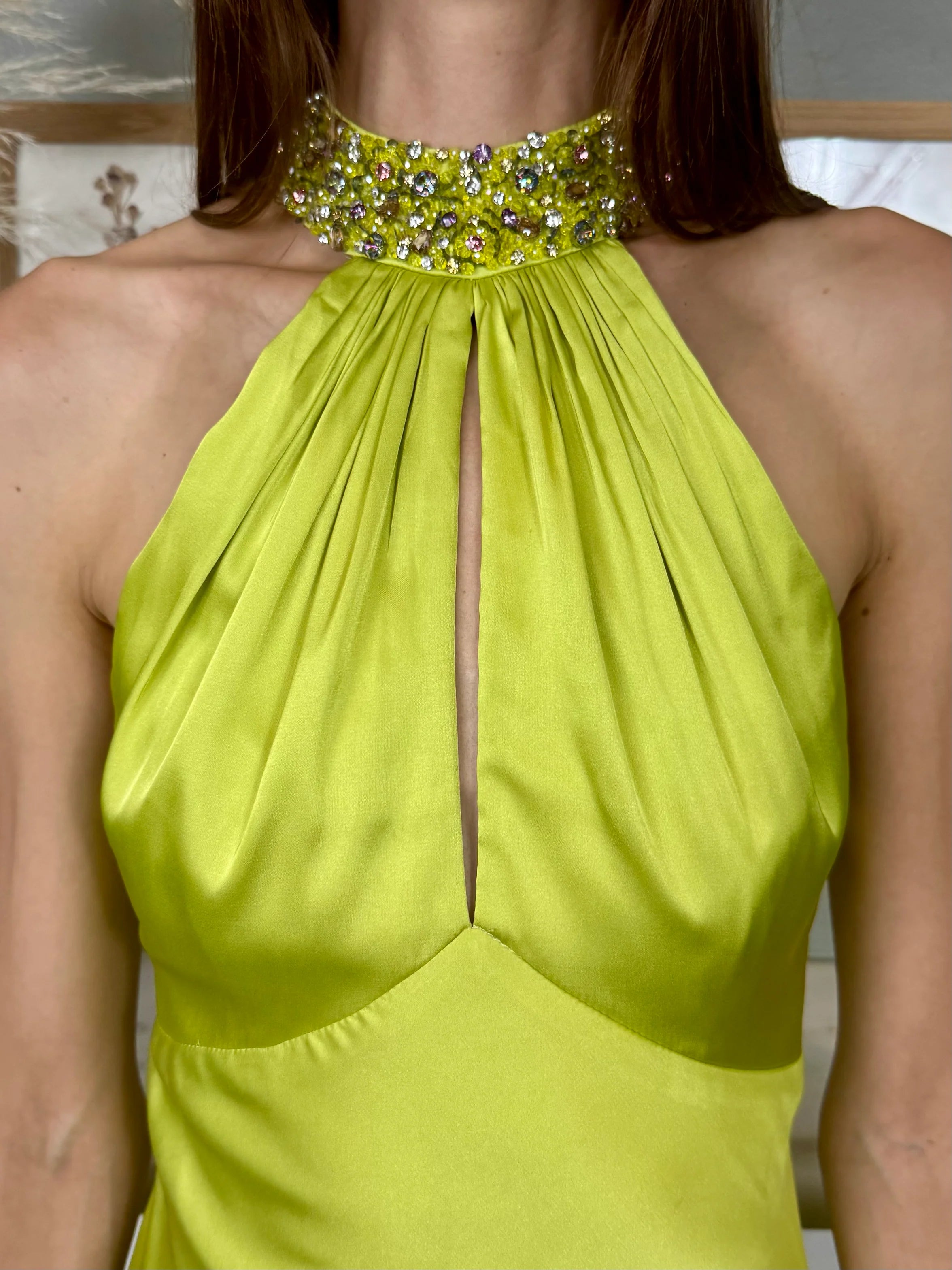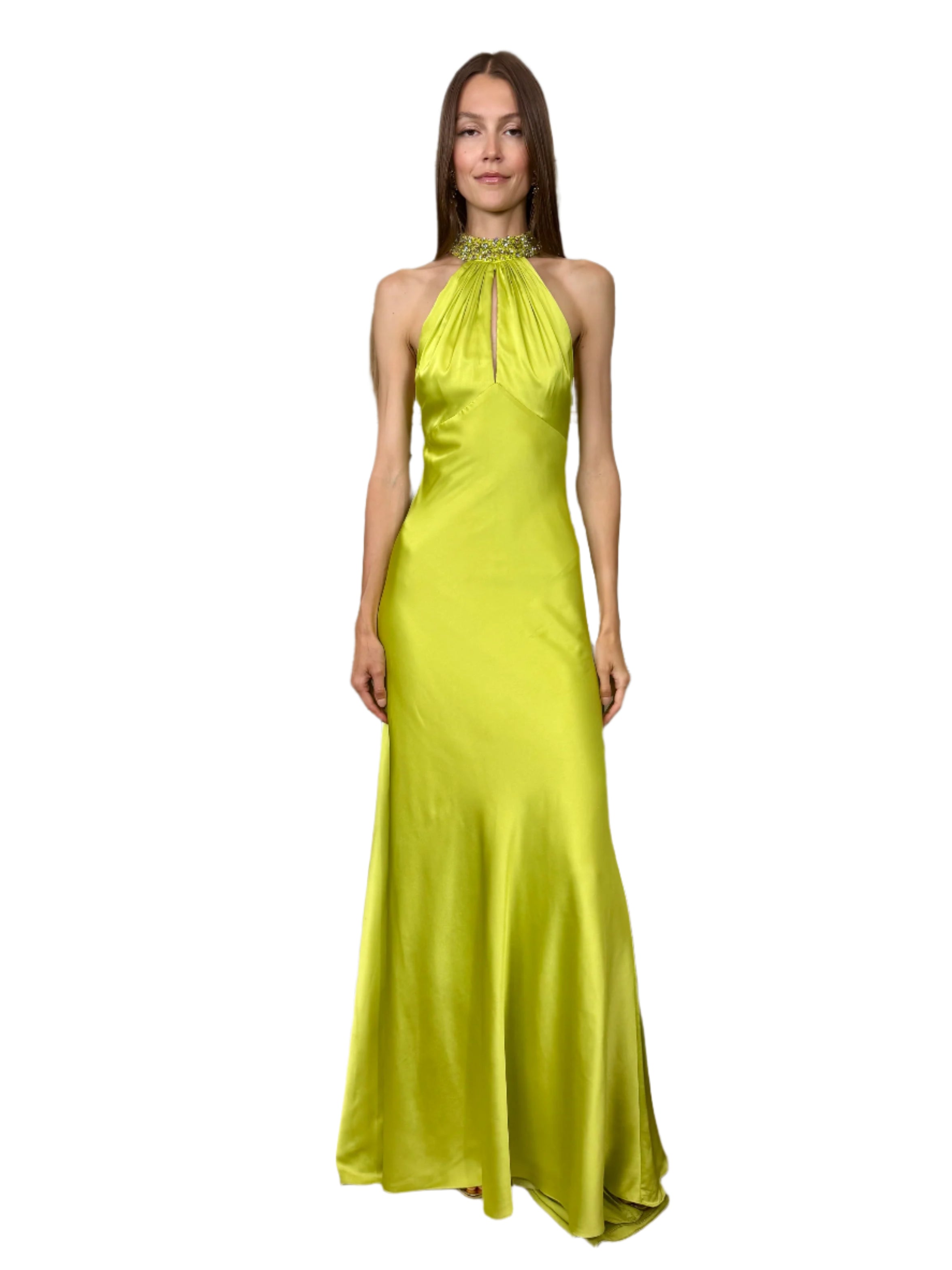 Introducing Lina, a show-stopping 80s silk dress in vibrant lime green. Stunning features include a halter neck design with a beaded collar, and a bias cut silhouette that flatters every figure. The open back and back zip add a touch of allure.