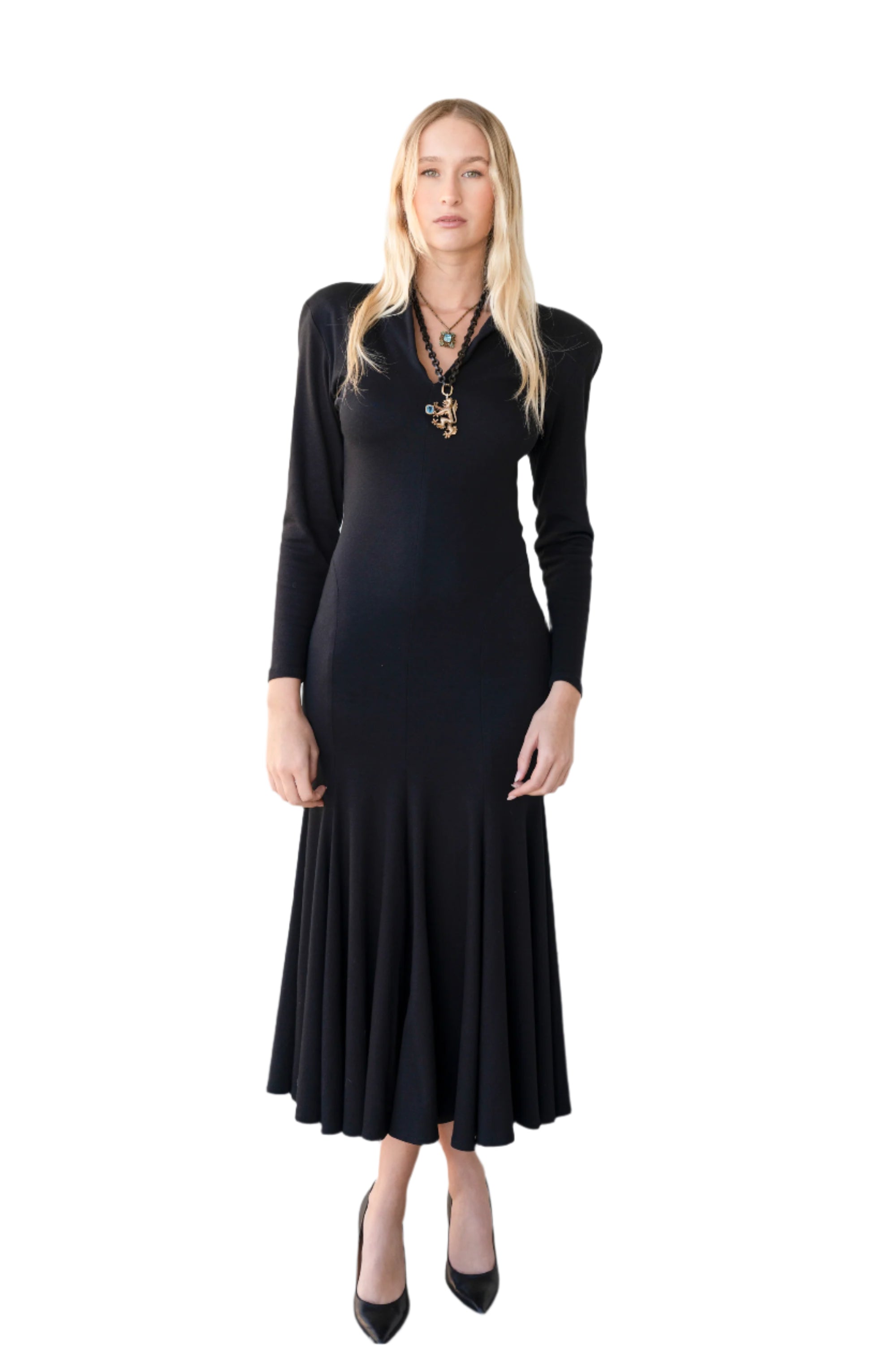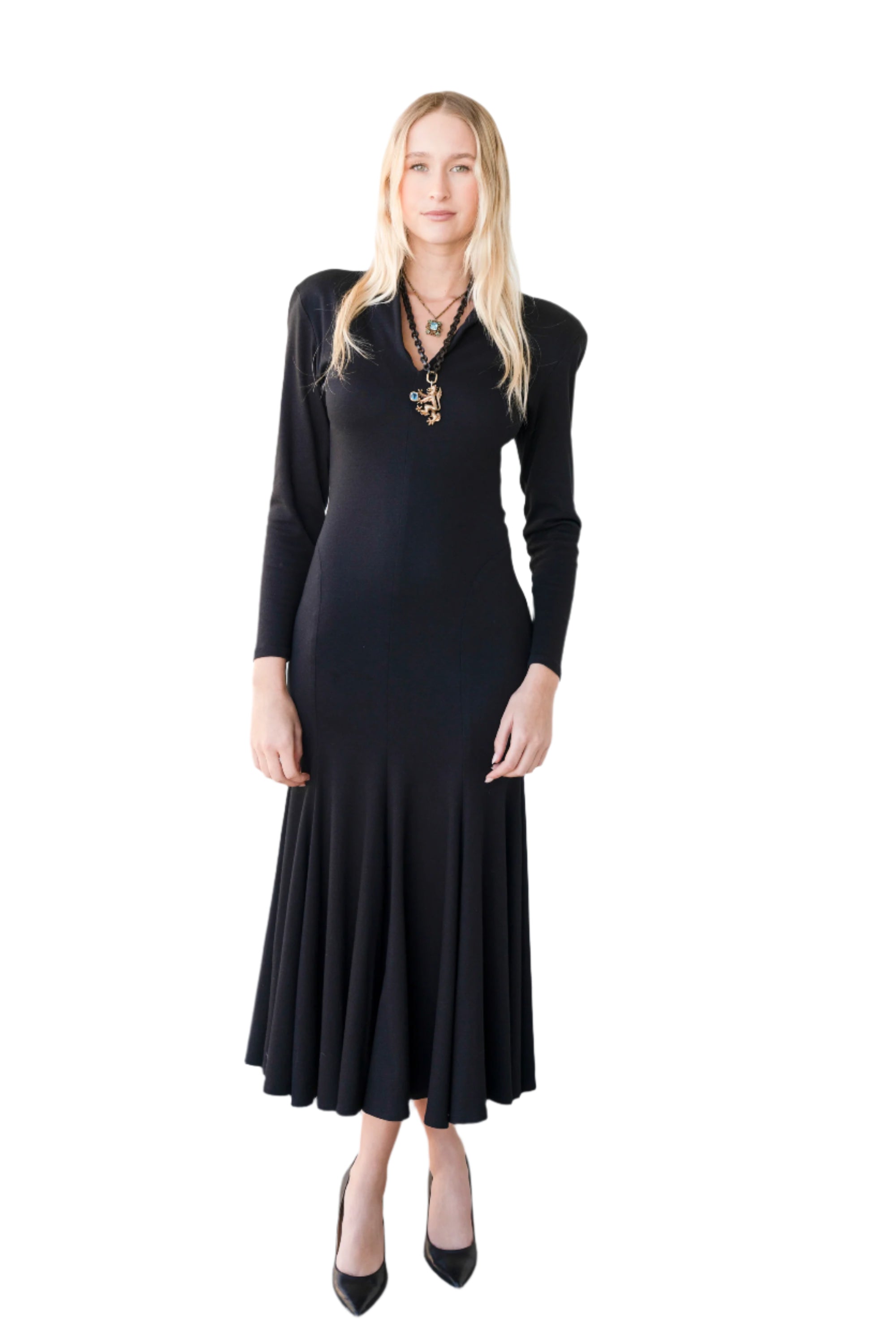 A timeless vintage Norma Kamali piece, this figure-flattering black cotton maxi gown boasts an elegant fit enhanced by dramatic shoulder pads. Shine with its oversized pads, long sleeves, slim frame and smart pleating. Made in the U.S.A.