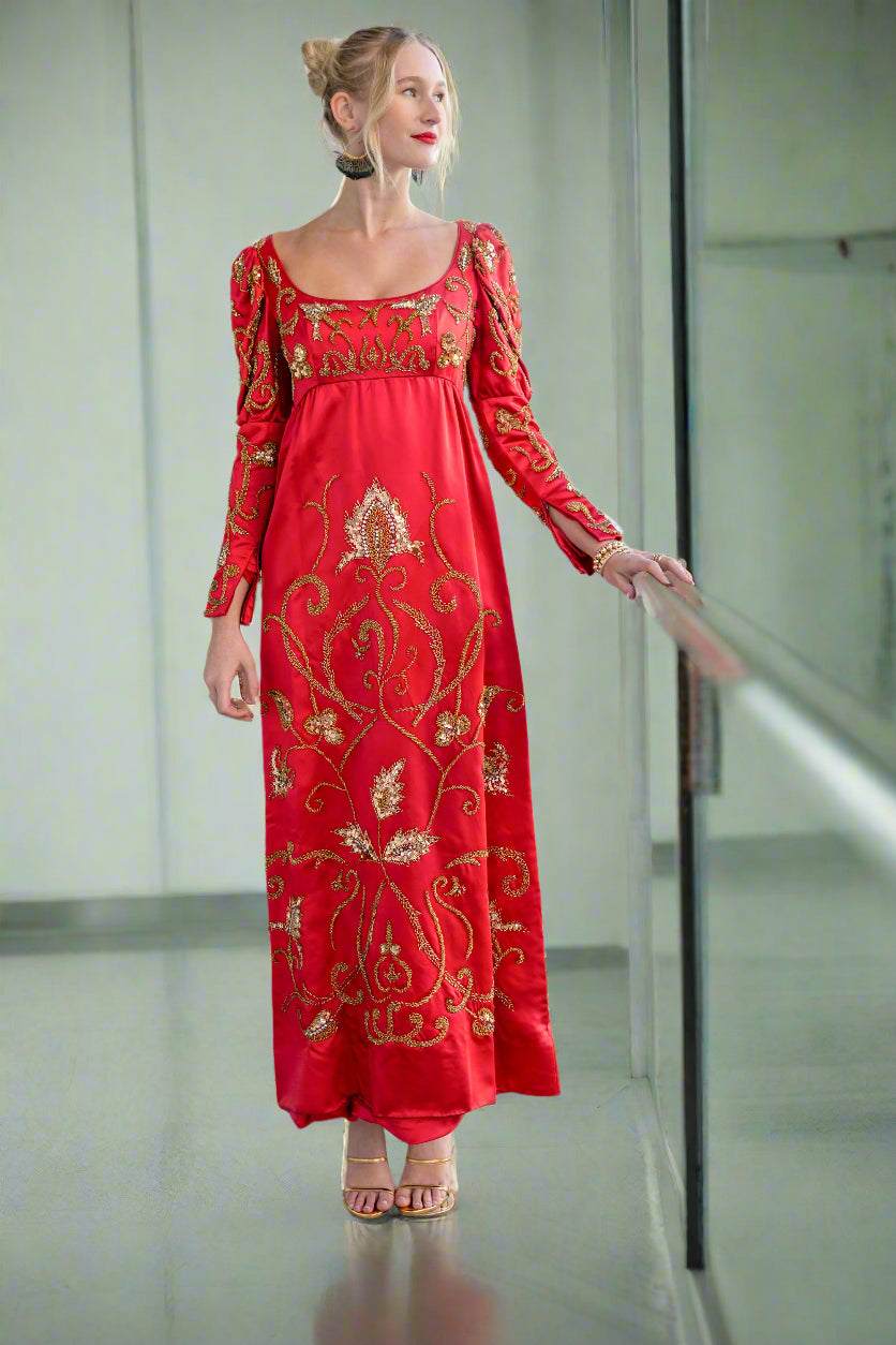 Indulge in this rare vintage 1960s red satin empire waist gown from the renowned Hollywood designer Michael Novarese. Adorned with delicate Renaissance-inspired embroidery and gold floral beading, this haute couture creation will take your breath away. Absolutely stunning in person.