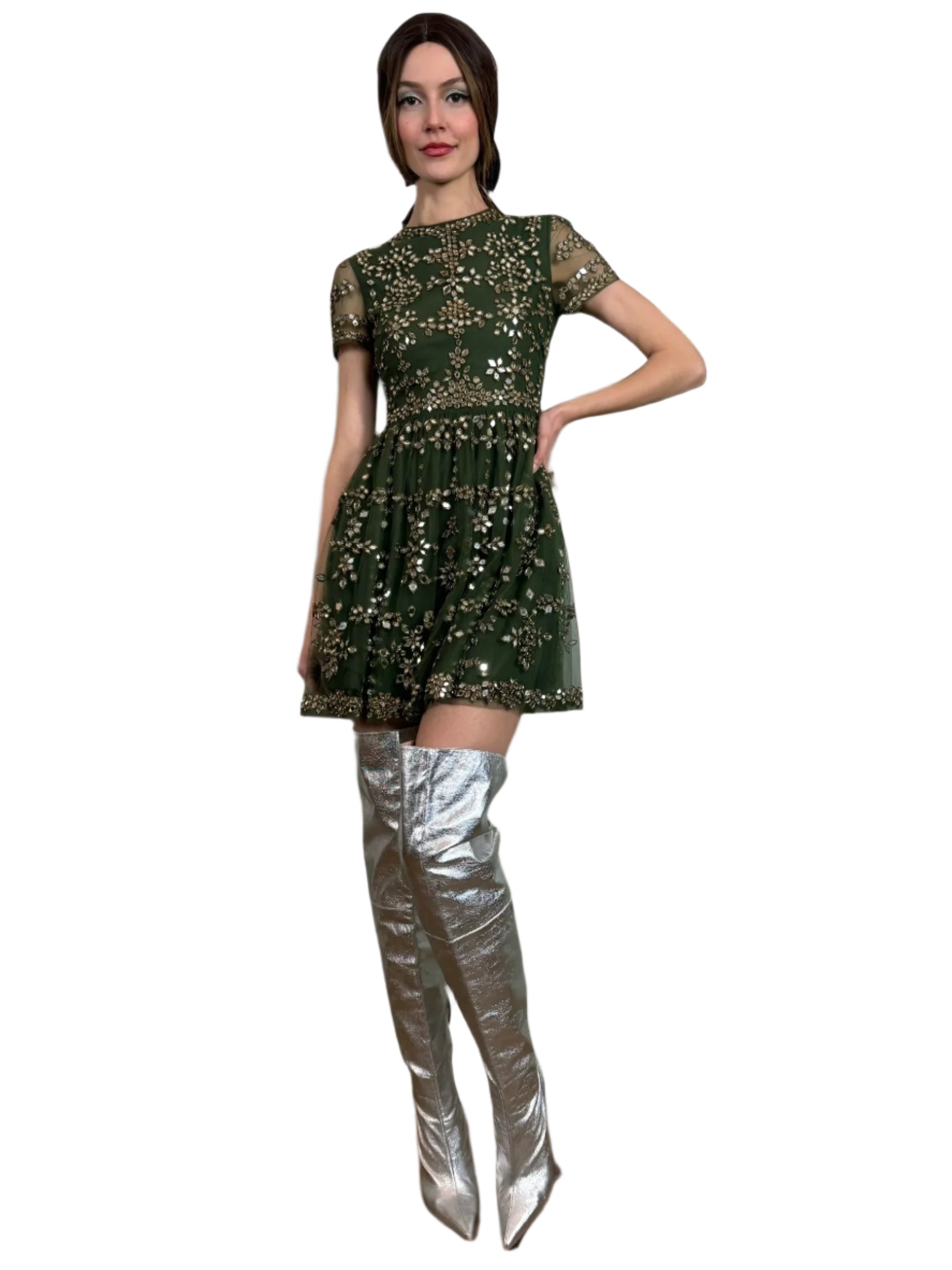 This unworn collectable Valentino by Piccioli’s creative runway dress is a rare find, featuring a baby doll silhouette, tulle fabric, and sparkling mirror embroidery throughout. With short sleeves and a full skirt, this dress is both playful and elegant. Don't miss the chance to own this unique piece from the 2019 collection.