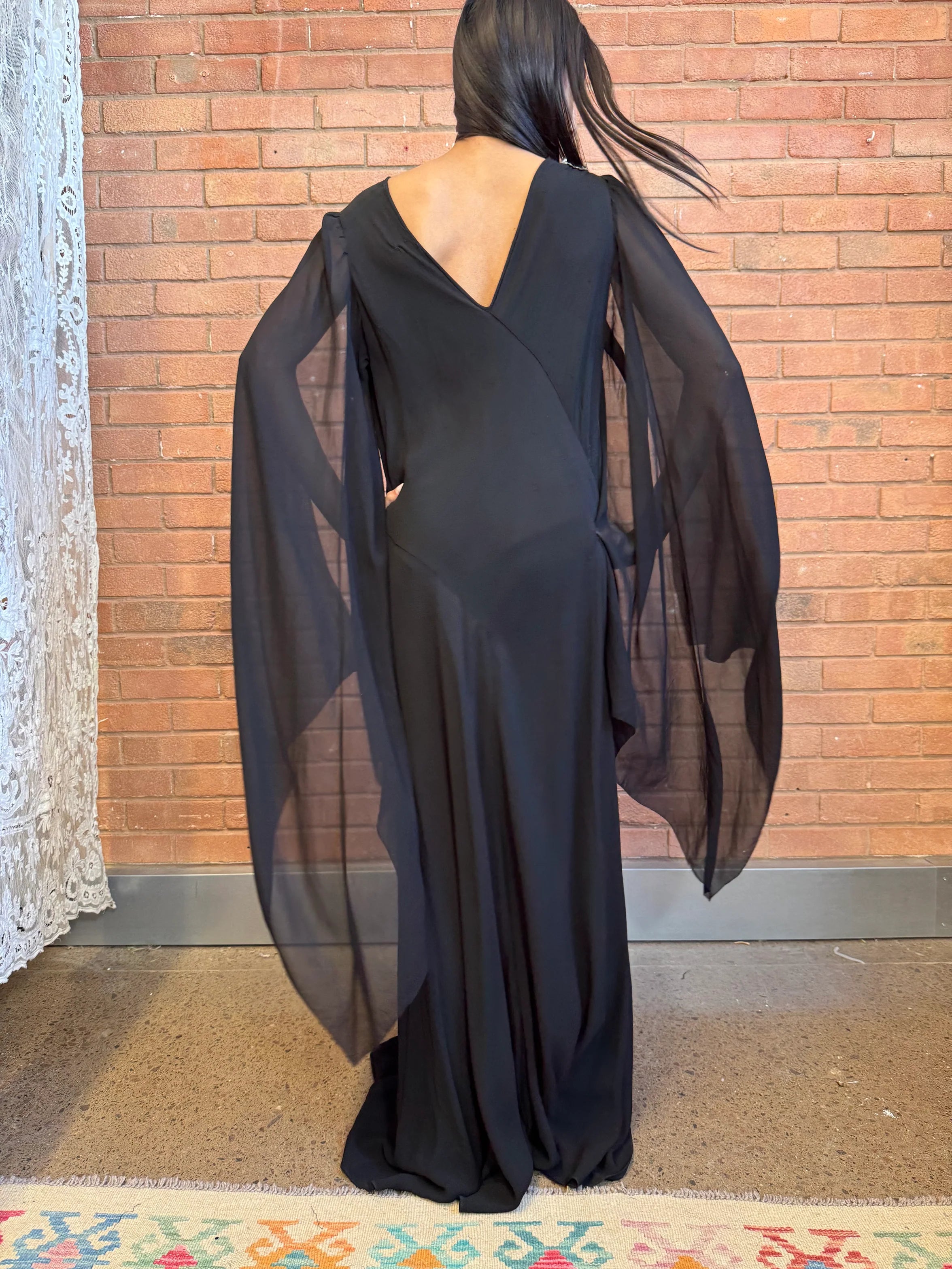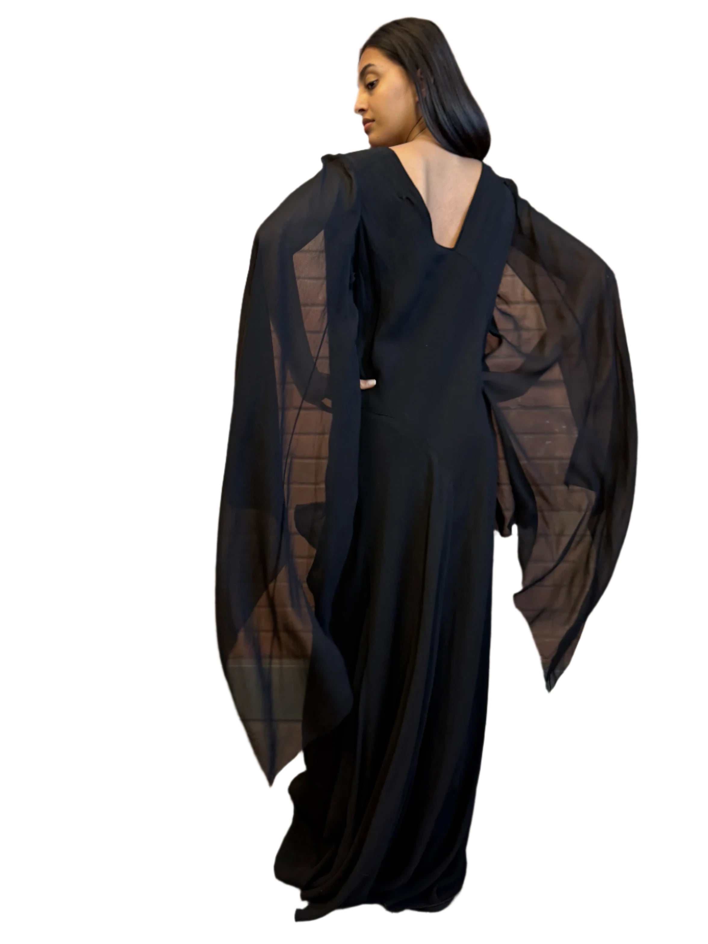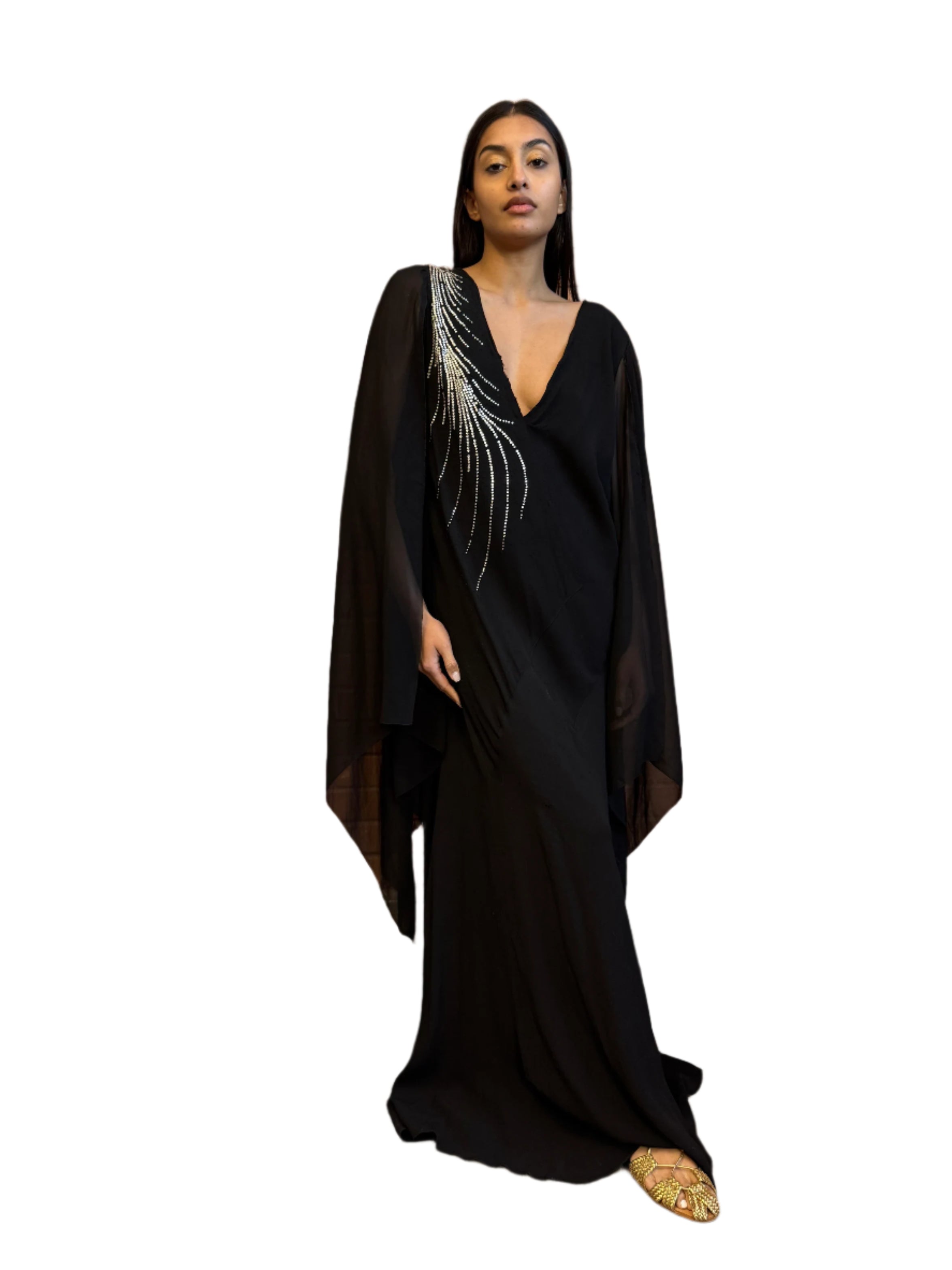 This stunning 30s bias cut piece features a front V-neck and delicate angel sleeves, with a seductive rhinestone leaf design that adds just the right amount of sparkle. The bias cut flatters your figure and moves beautifully along with your body. Step into elegance and sophistication with this fabulous dress.