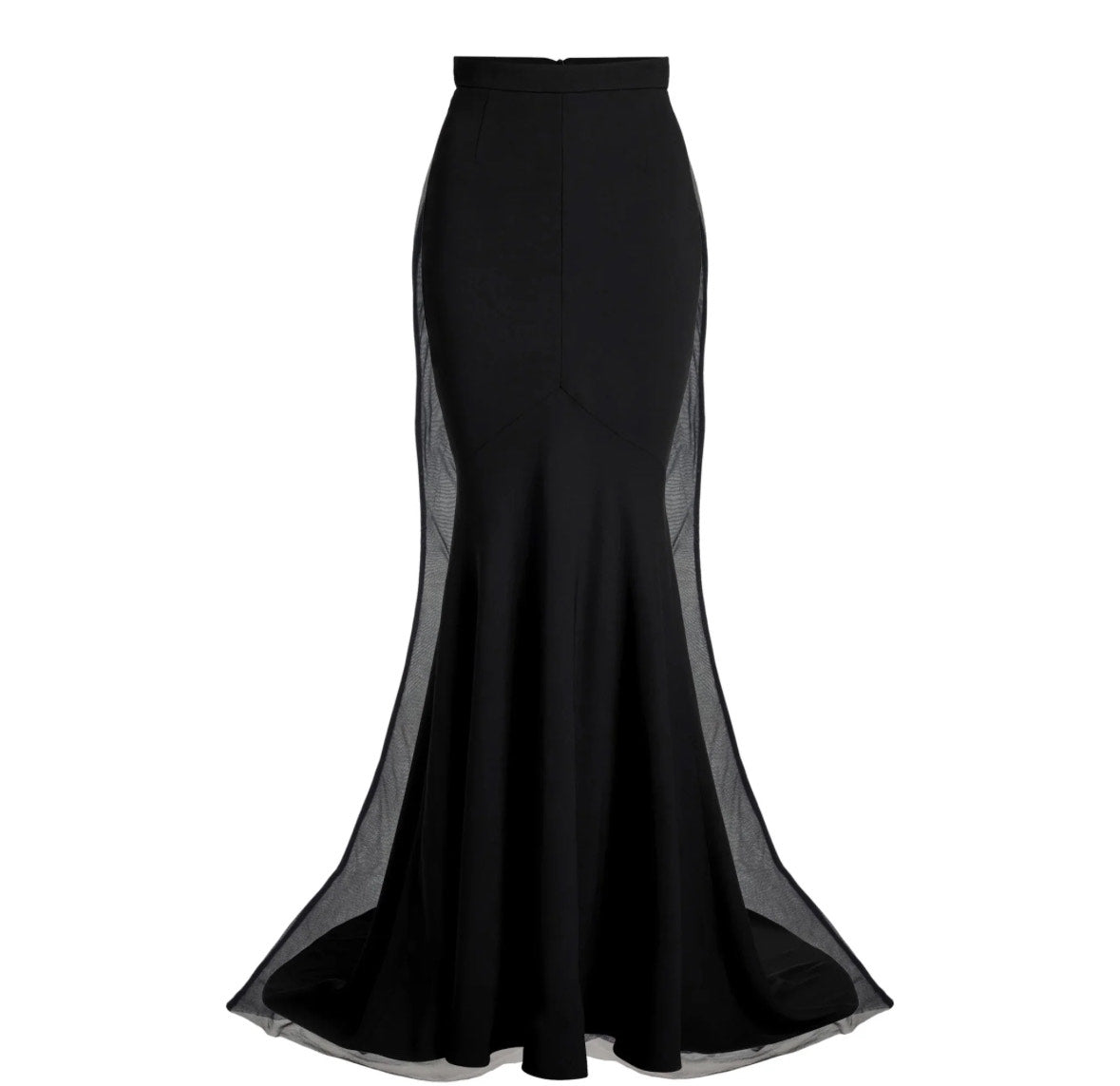 This mermaid-style skirt combines crepe and net layers to create a sculpted, flowing silhouette. Delicate cross-stitch hand embroidery accents the back, adding an artisanal finish to its dramatic shape. A standout piece for formal occasions with a focus on detail.