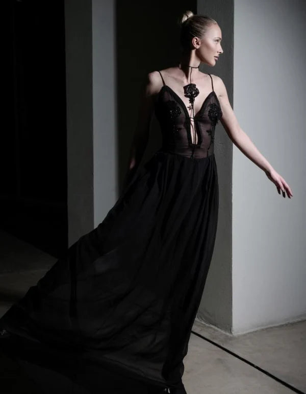 Whisper-light and artfully composed, this sheer long dress is a canvas of hand-stitched cross-stitch embroidery, flowing from front to back in quiet intricacy. Glints of crystal beadwork catch the light, while a soft tie at the neckline adds a romantic, undone edge. Pleats gather gently at the waist, giving way to a silhouette that moves with grace. Crafted for those who drift between elegance and ease.