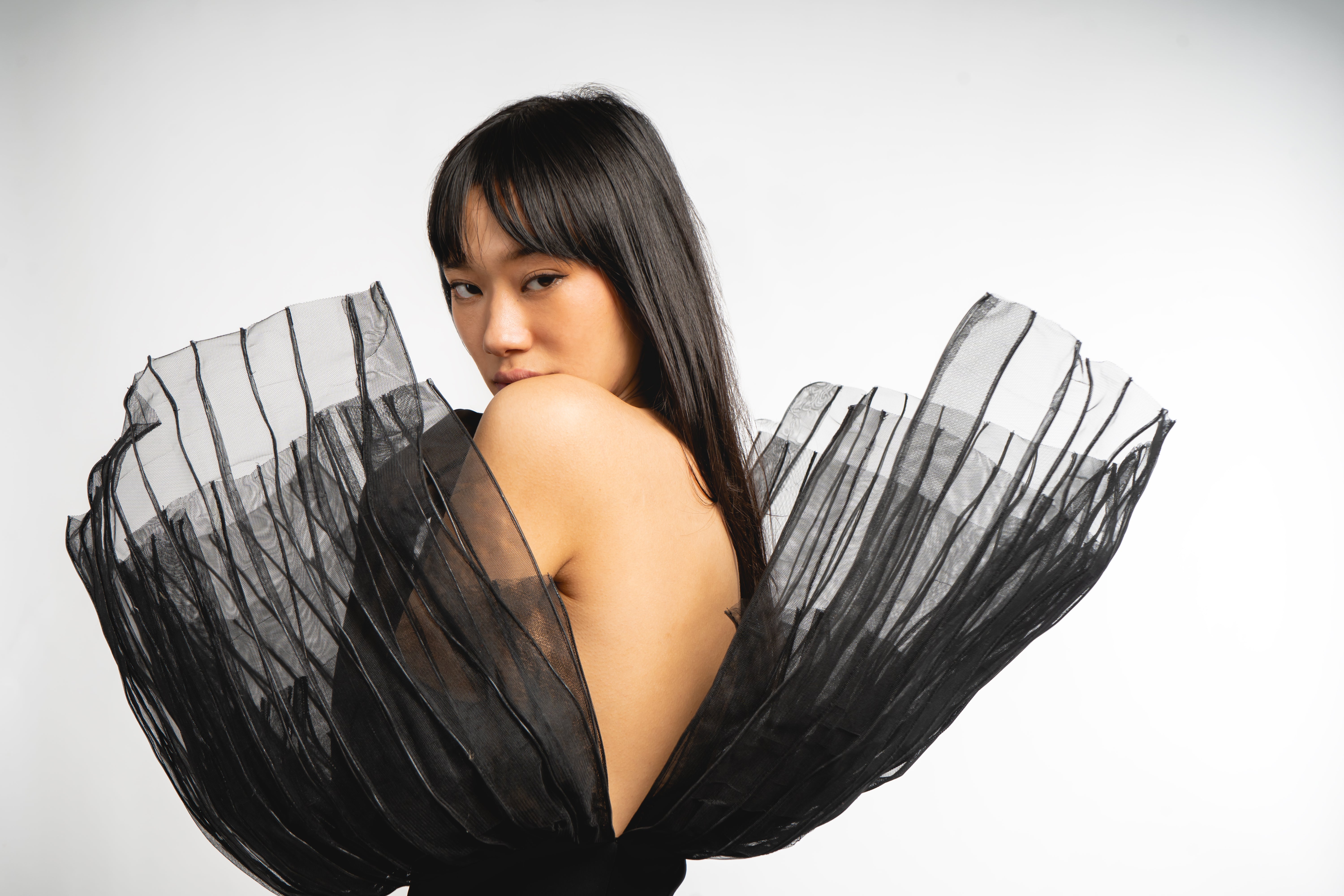 This sculptural corset fuses delicate craftsmanship with architectural structure. Made from sheer can-can fabric, it features intricate pintuck detailing and flexible internal wiring that shapes a sharply contoured silhouette. Layered sheer panels at the front add volume and visual depth, while an adjustable lace-up back ensures a precise, customizable fit. A bold, standout piece designed for avant-garde styling and refined statement looks.