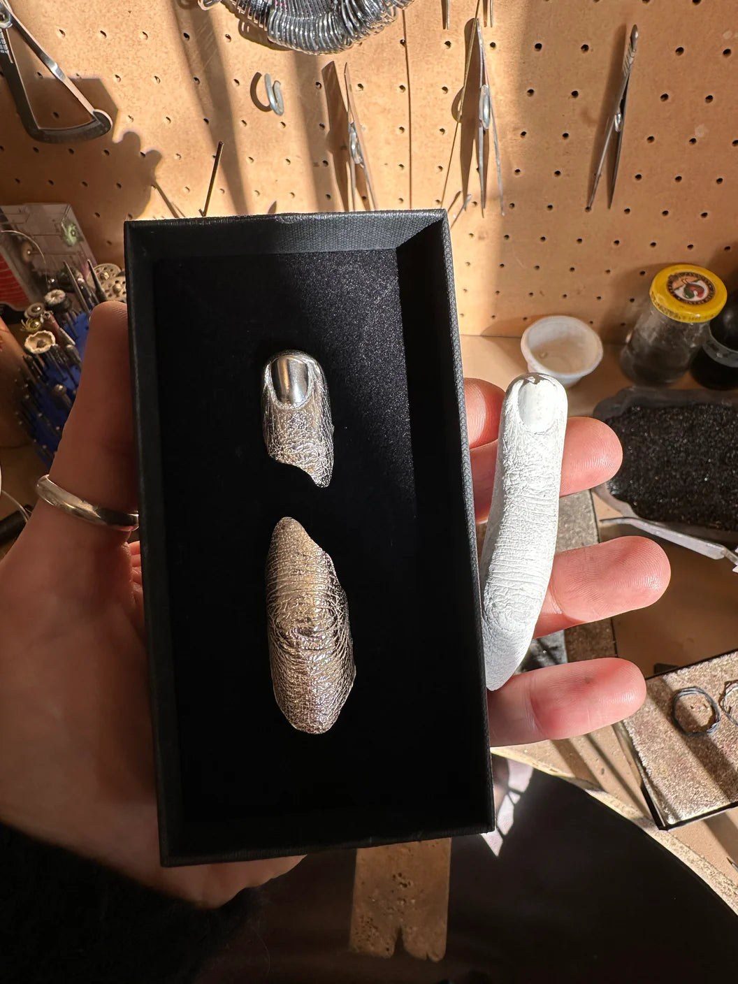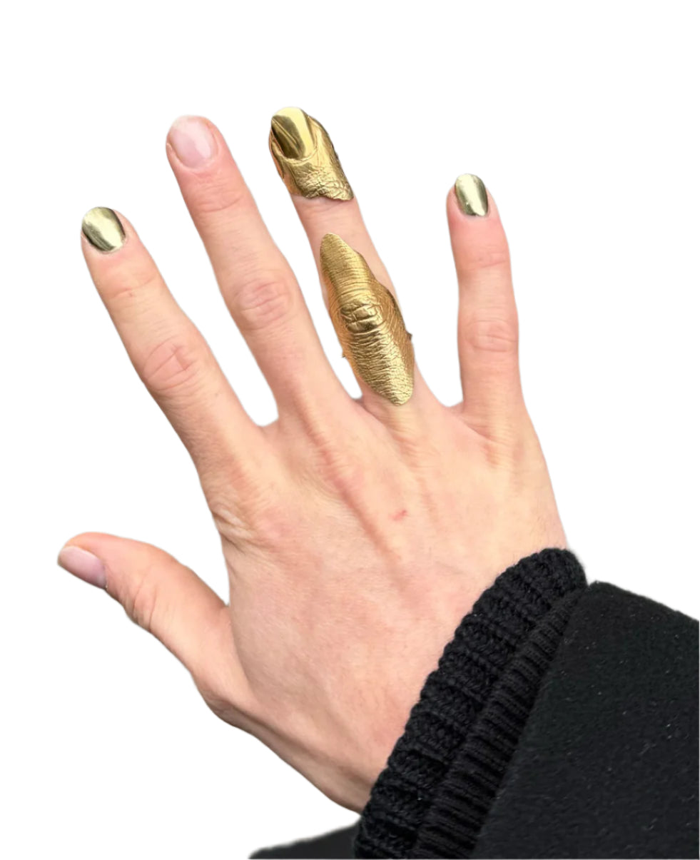 Custom-made finger piece rings, i.e. from the casting of your own finger, sold in two pieces, which can be worn together or separately, in bronze gilded with fine gold or solid silver (your choice)