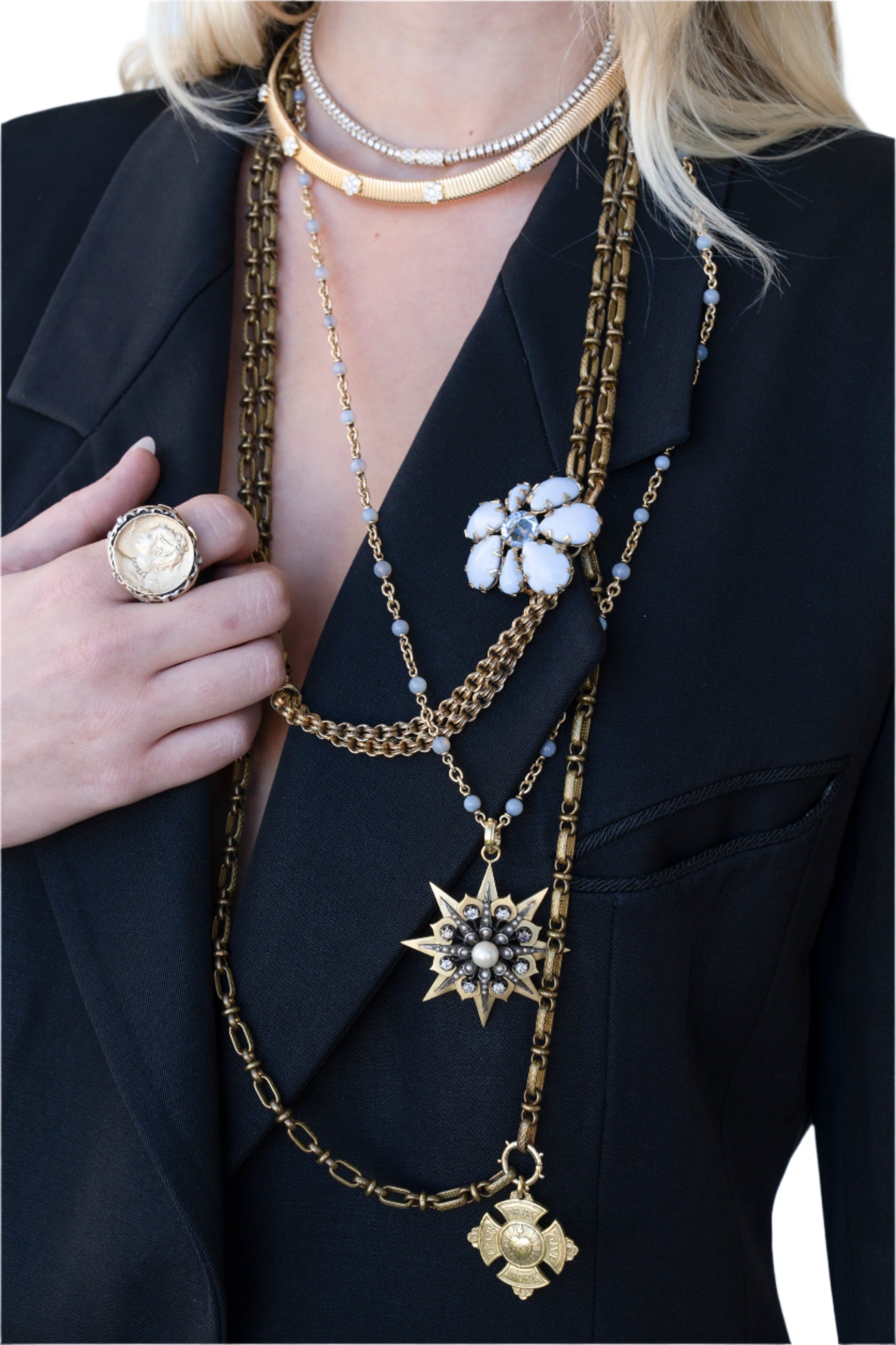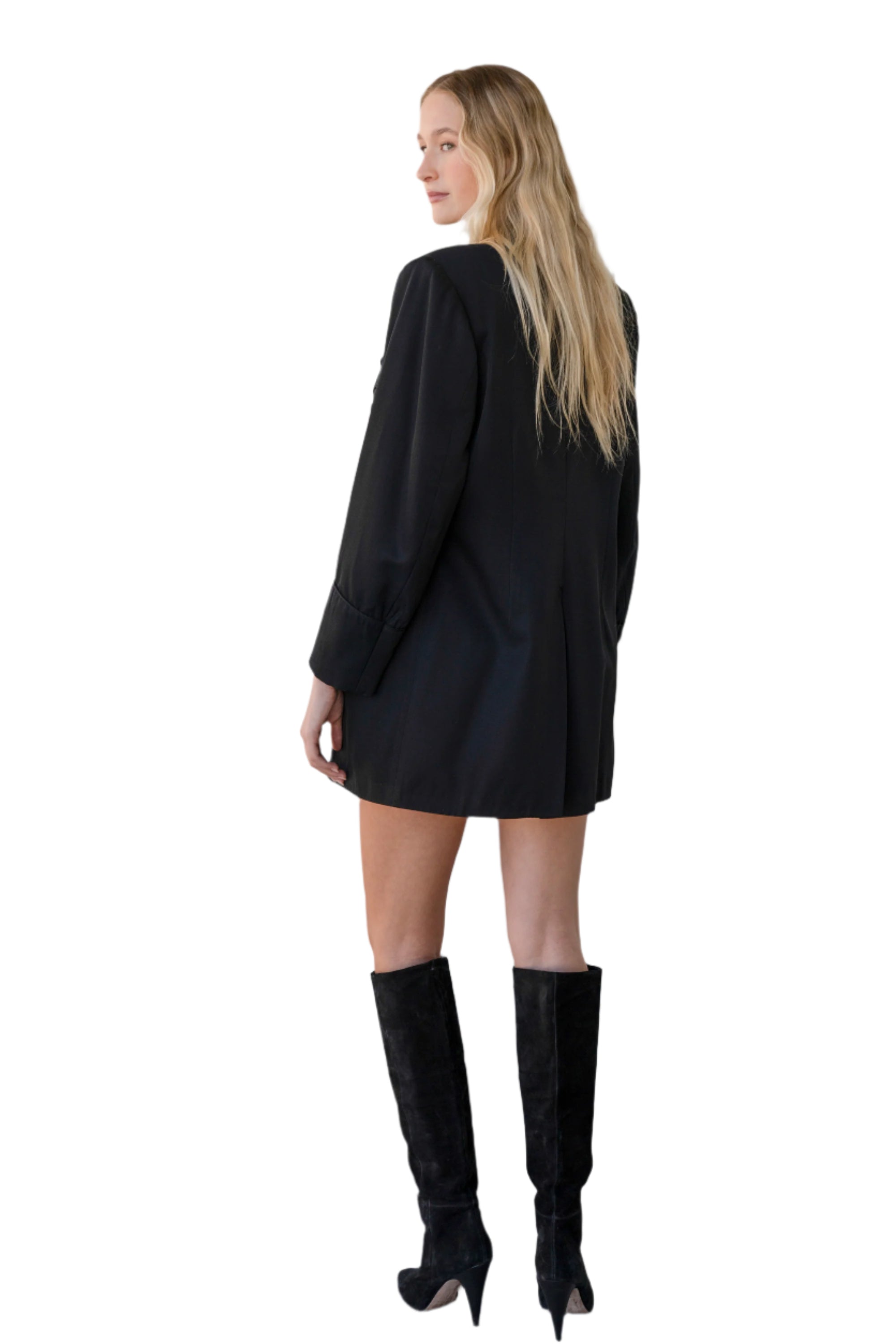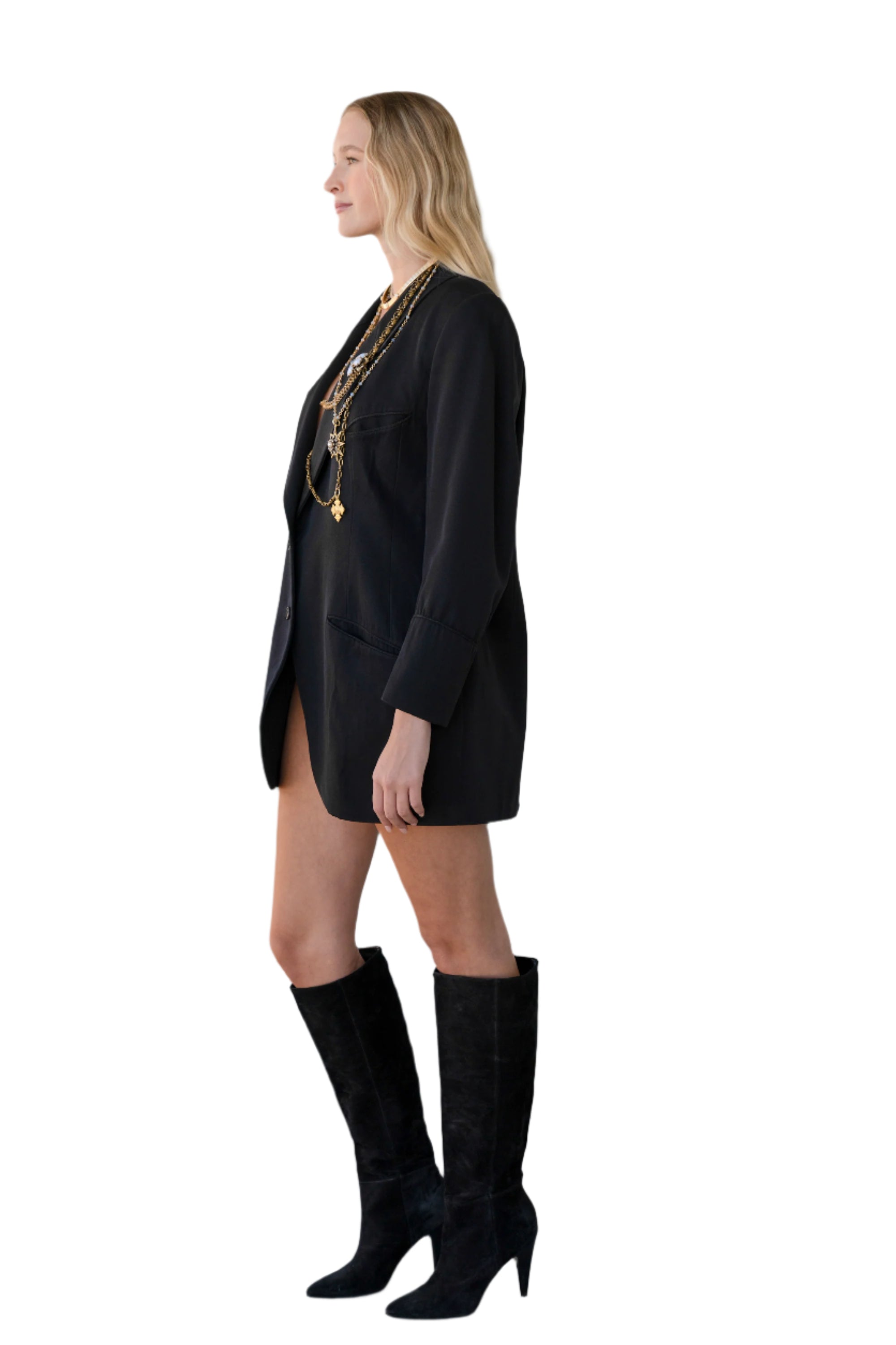 Often seen on runways or street style, this oversized suit blazer can be worn with matching pants or a pair of jeans. For a more dressy twist, style it with leggings or a dress. We opted for knee high boots and layers of necklaces styled by Jen Candler of Jen Statement Jewelry, letting the vintage suit blazer take center stage. Made in USA.