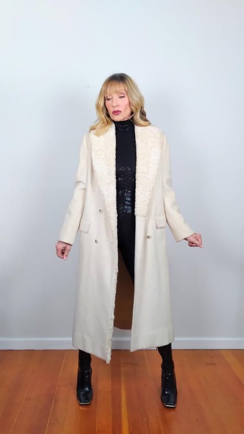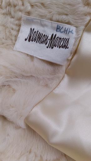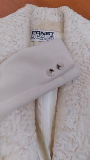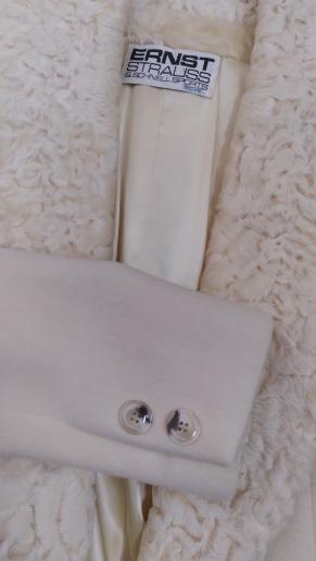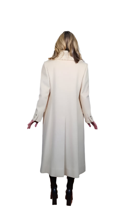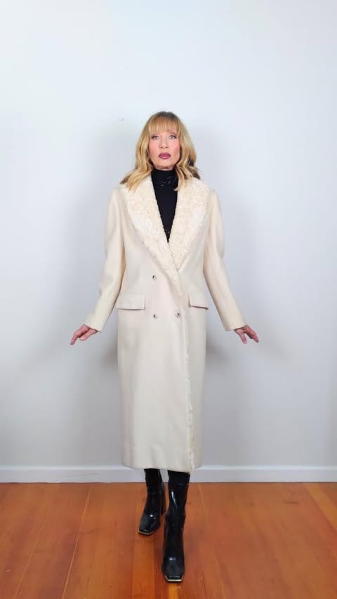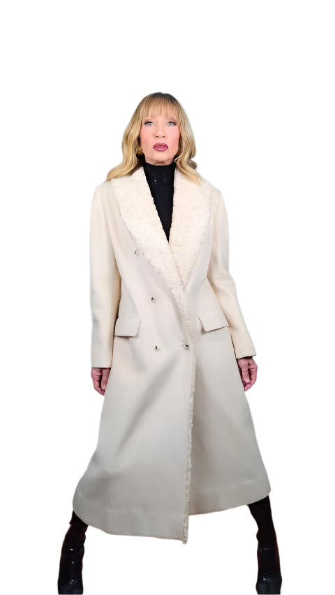 Soft Off White Wool and Persian Lamb Trim Double Breasted Coat by Ernst Strauss & Schnell Sports for Neiman Marcus. Satin Lined. Pockets. Front Lapel Pocket. Back Kick Split. Midi Length.