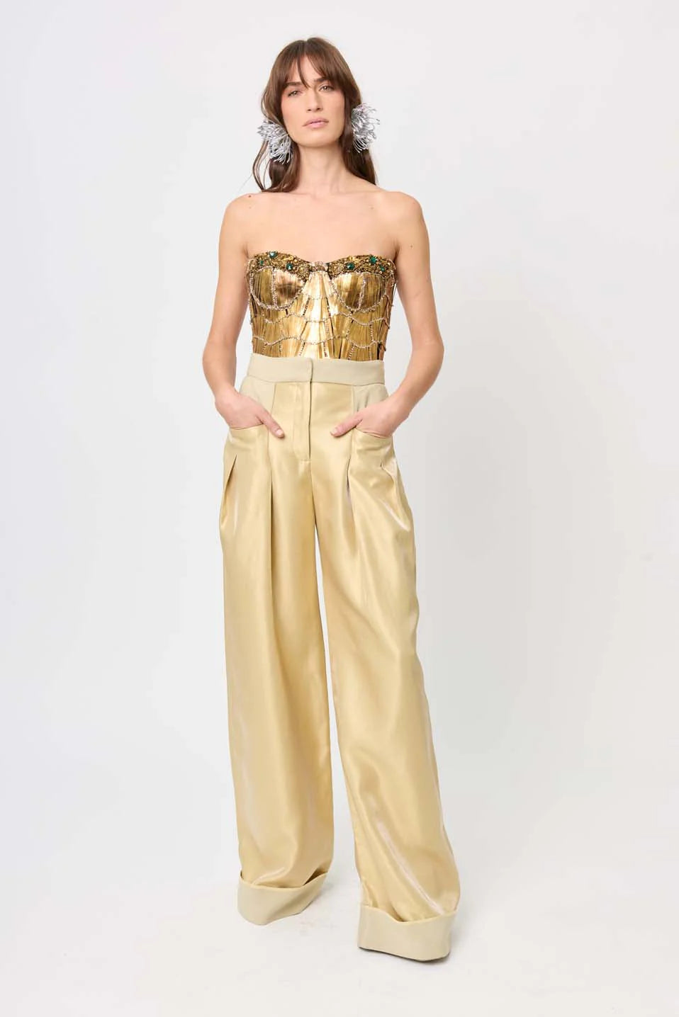 This striking strapless bustier is hand-embroidered with gold rhinestones. A standout favorite, it embodies femininity and power. Pair it with the Wisdom Pants for an unforgettable, eye-catching look