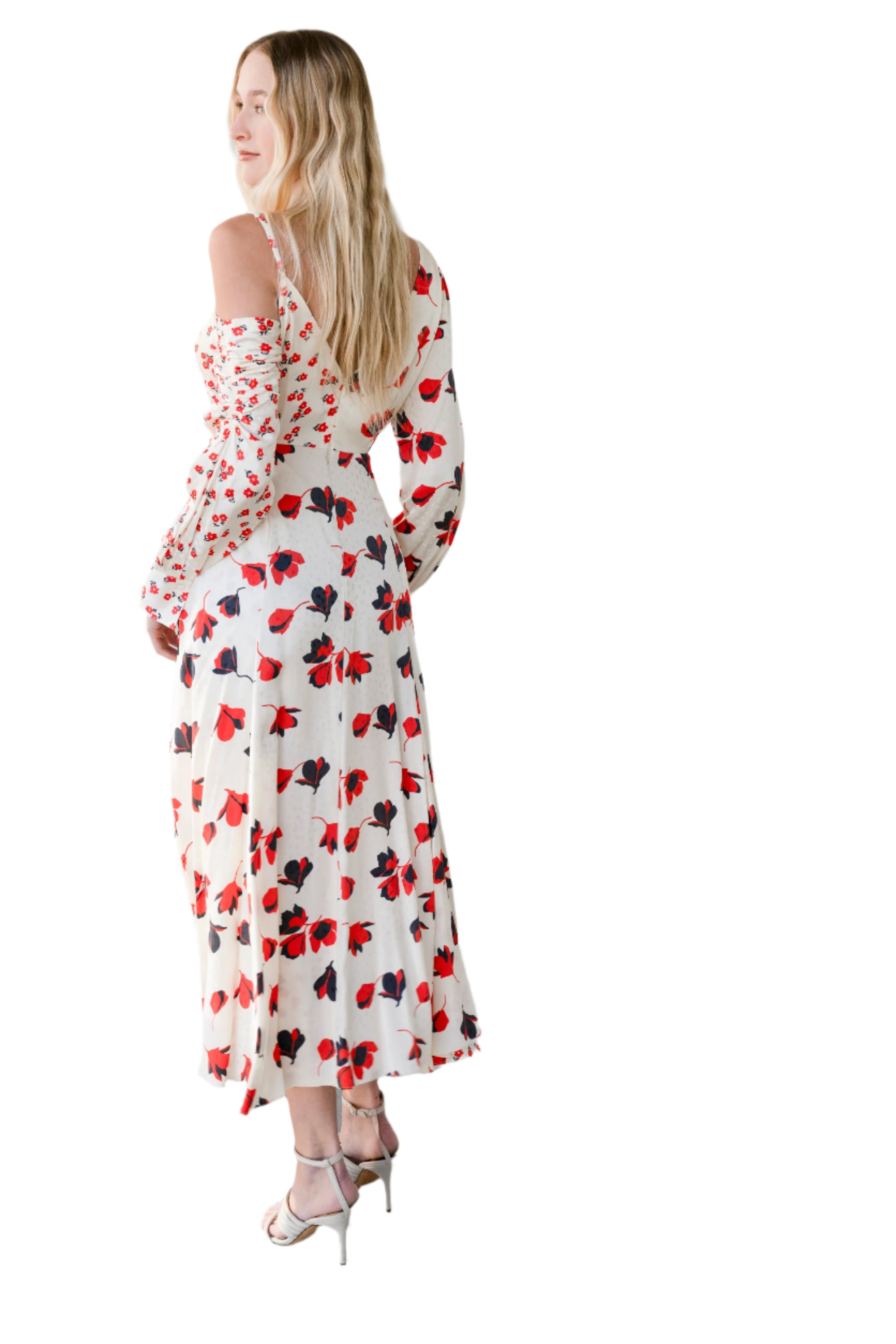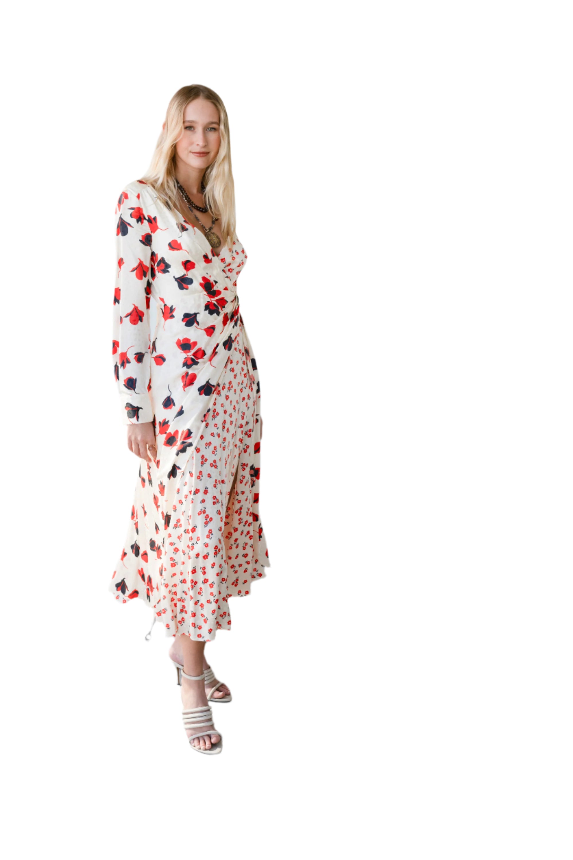 This beautiful satin Self-Portrait wrap style dress in white has a lovely red floral, long sleeves, a high side thigh split at the front, plunging neckline and left shoulder exposure. The zip closure is concealed at the back.