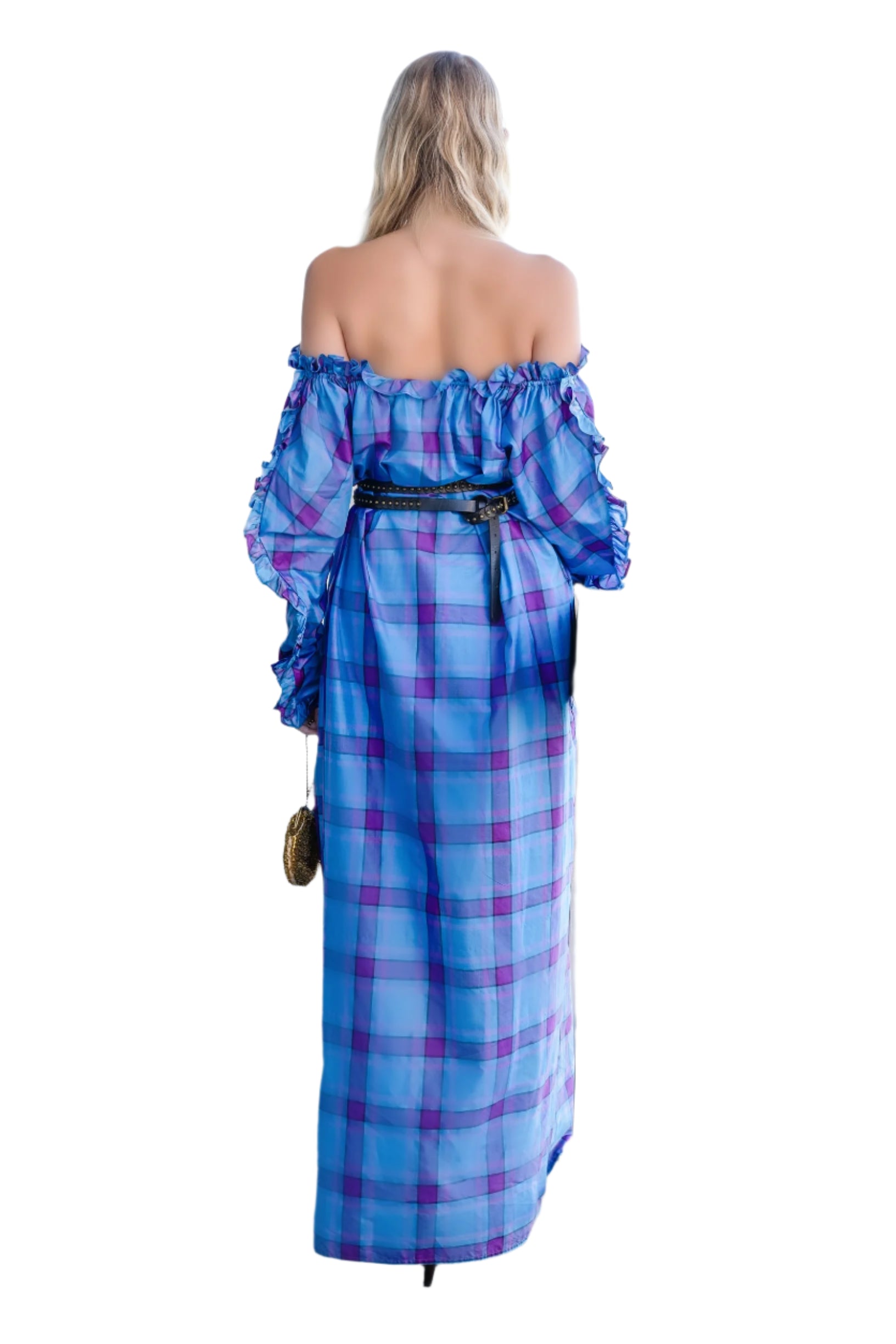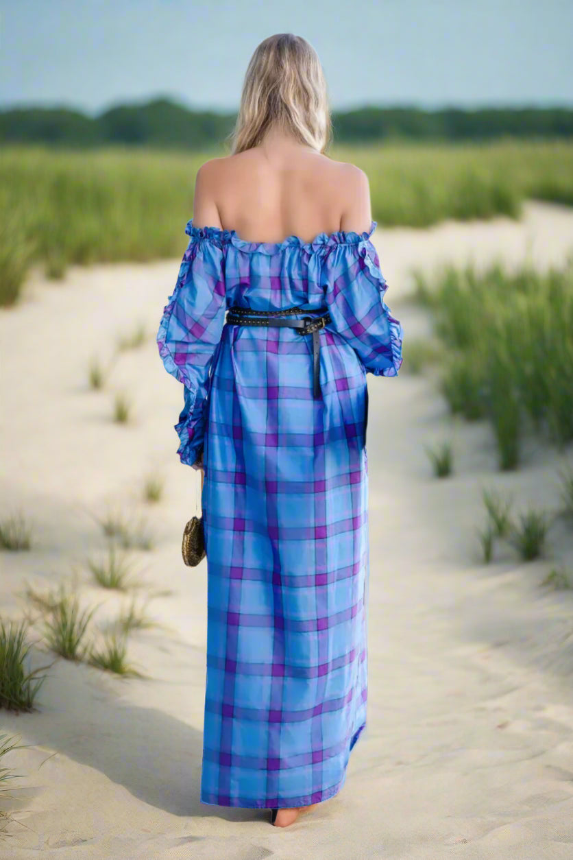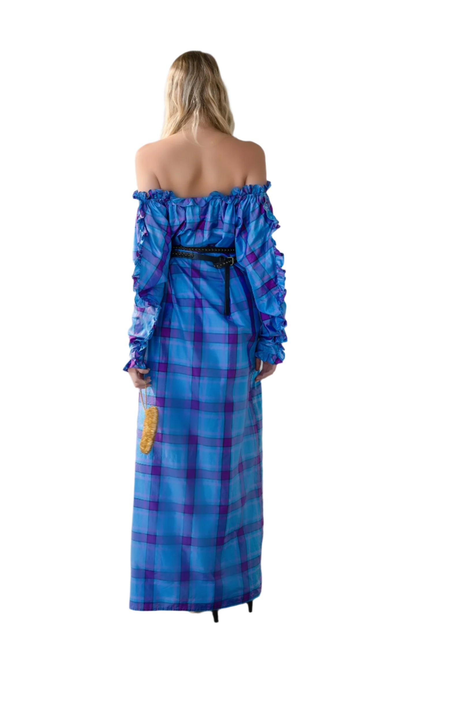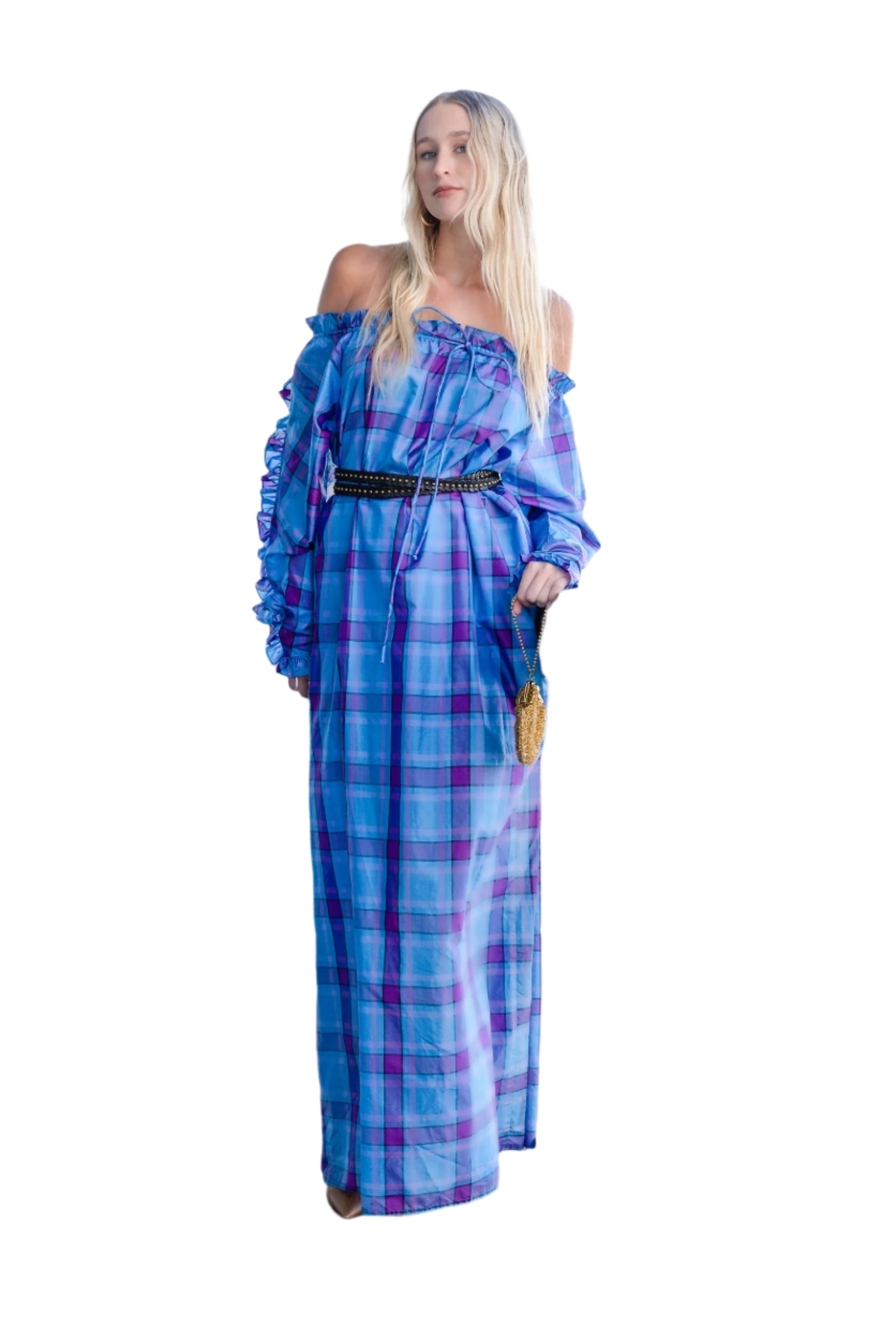 Experience the unmatched quality and timeless elegance of designer Bill Tice. This 1980s documented dress is crafted from lightweight silk plaid in blue and magenta and features a boat neck with an adjustable string for versatile wear - loosen it up for an off the shoulders look or tighten it as you see fit. Adding to uniqueness of the piece, ruffles adorn the edges of the top and extend down the sleeves. With two front pockets, this unlined dress is a must-have for any fashion-forward individual. Can be worn as is or belted for a more structured look.