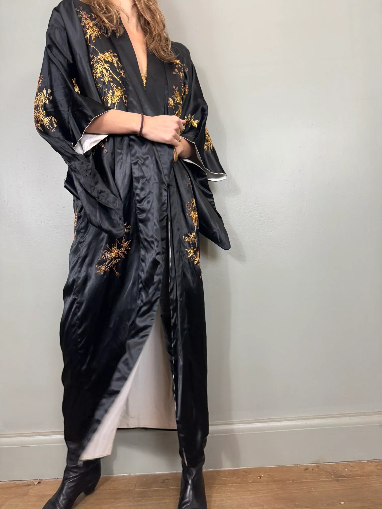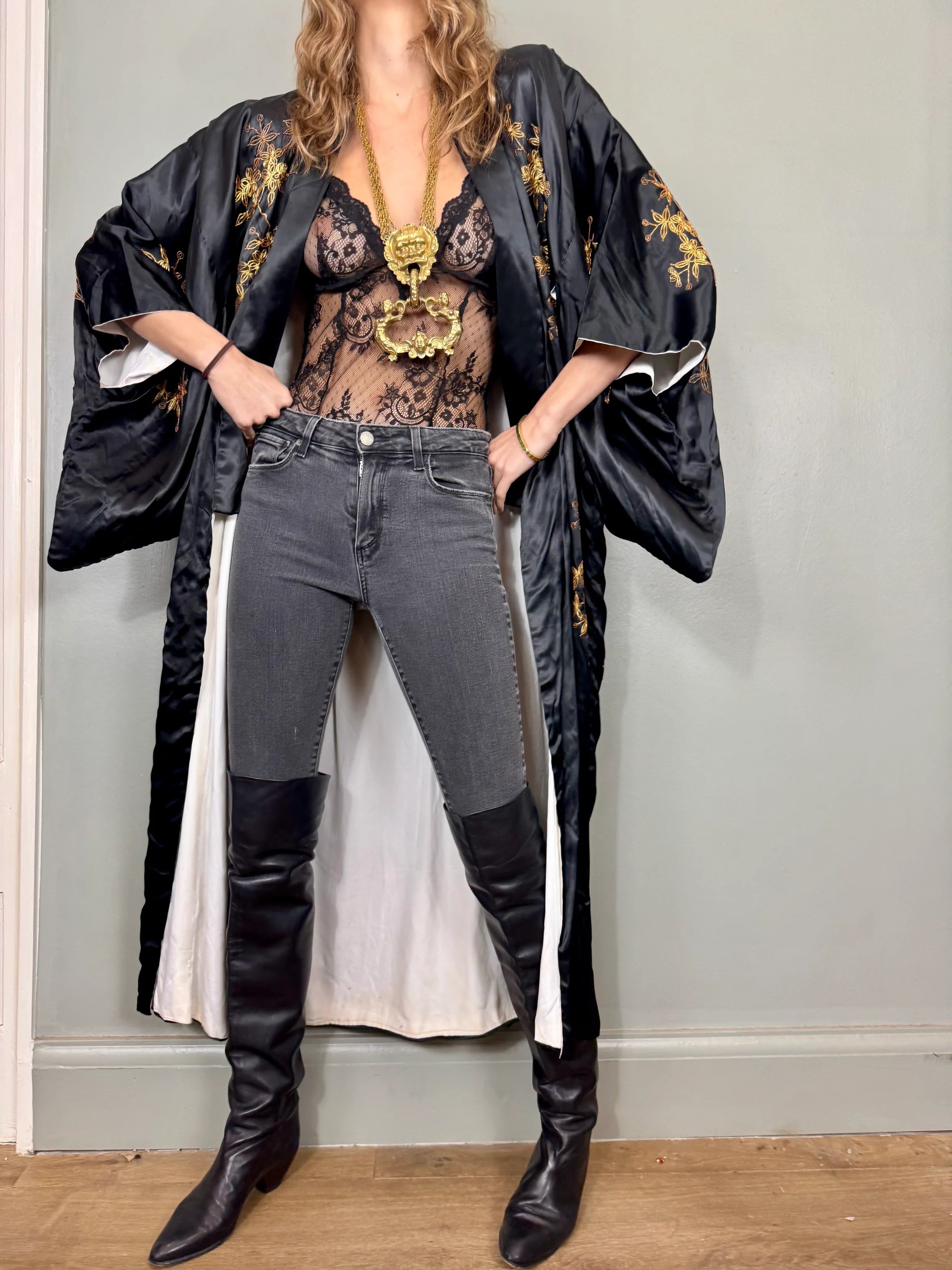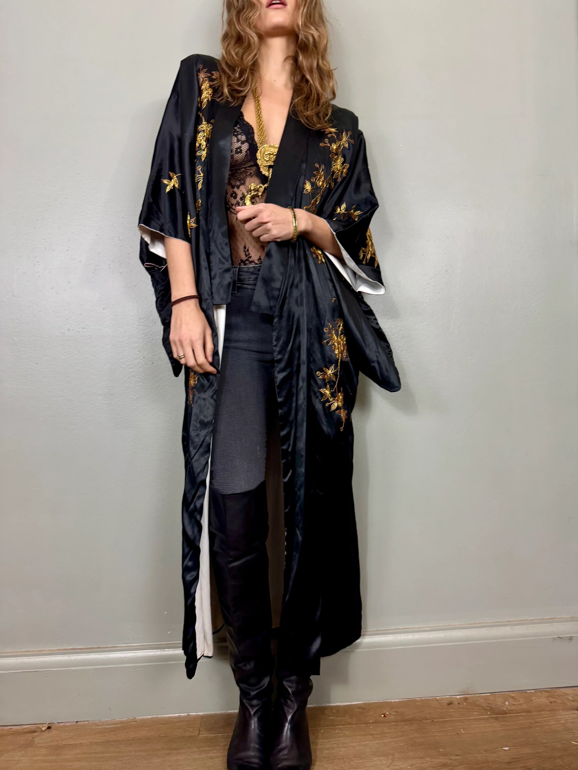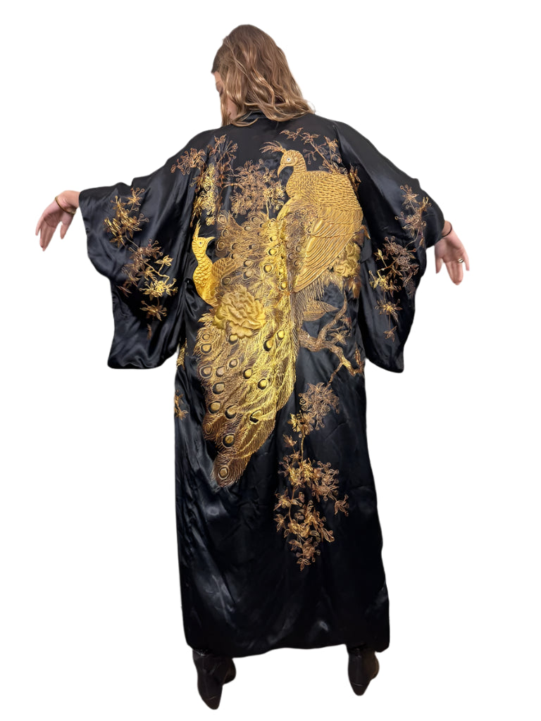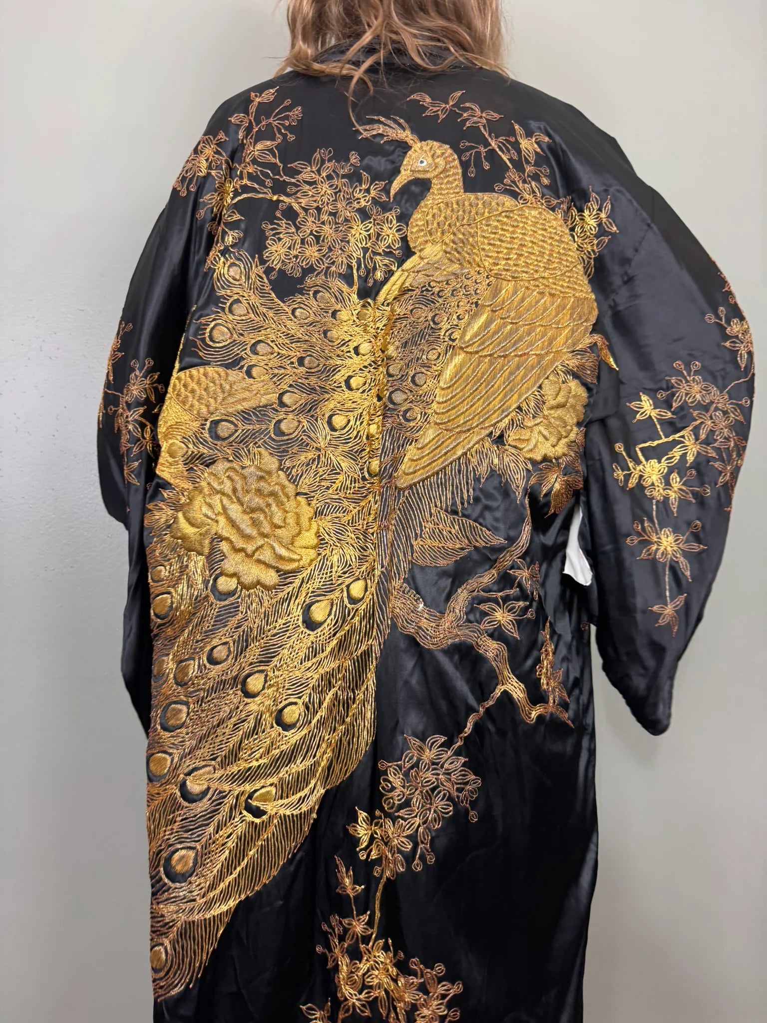 Stunning Japanese 40s kimono adorned with a majestic gold peacock embroidery on rich black silk. Indulge in the intricate details of this original piece, complete with a luxurious cream silk lining. Elevate any outfit with this timeless and collectible Kimono.