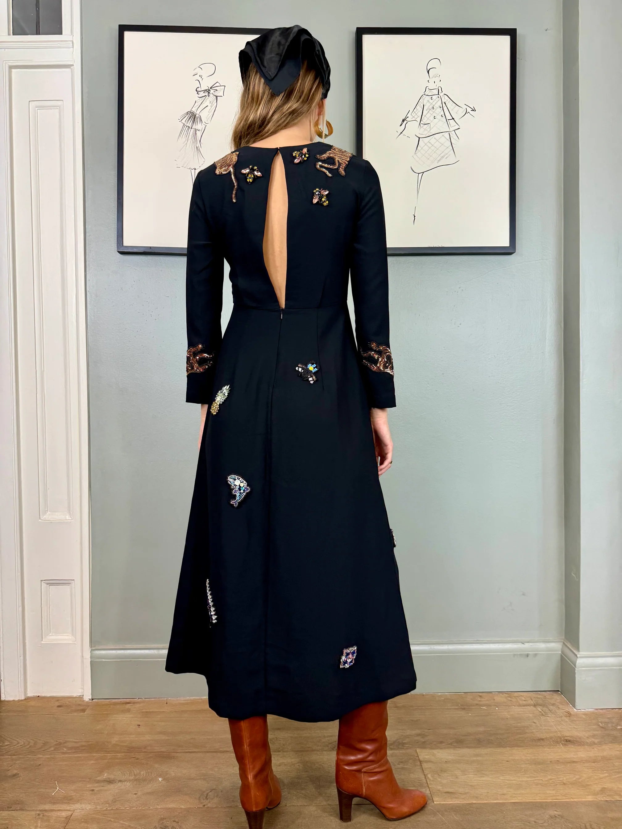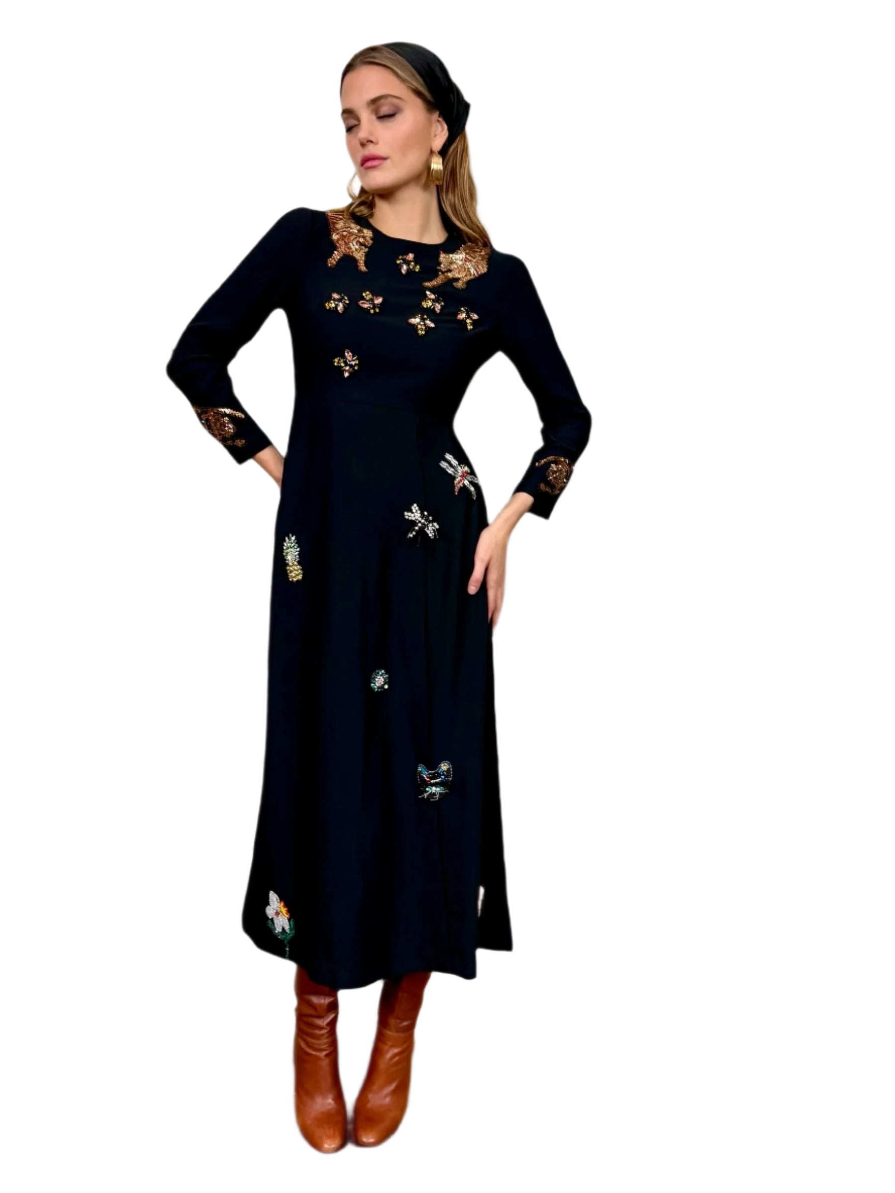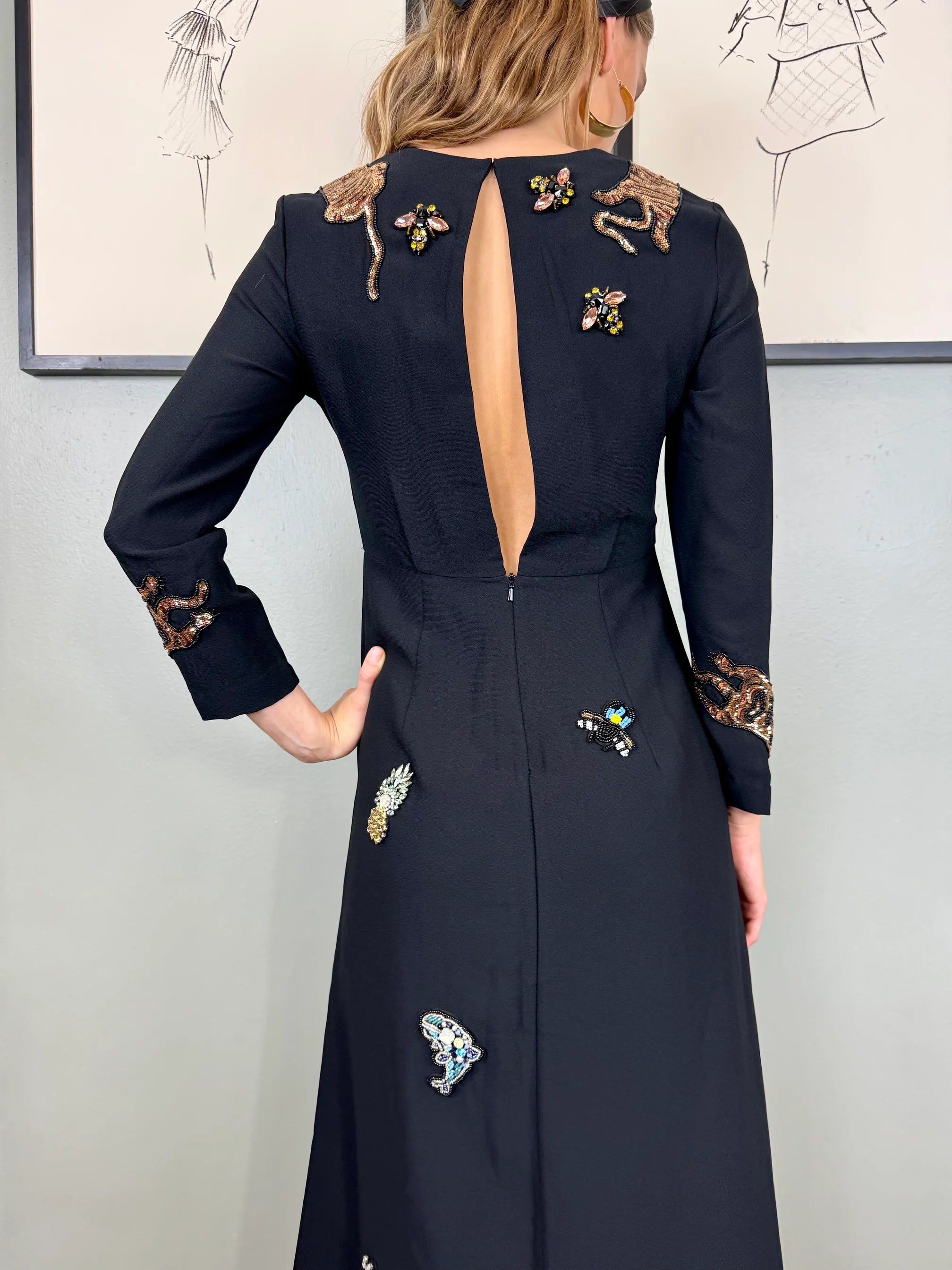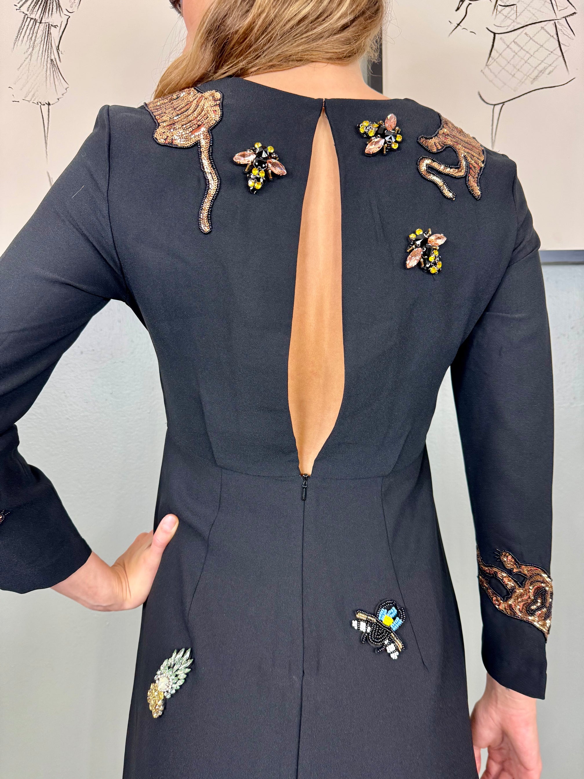 Achieve a vintage, glamorous look with Fabianna, a black long sleeve dress from the 70s. The A-line fit flatters any figure while the intricate beaded appliqués of animals, birds, and bees add unique charm. Has a keyhole design on the back and zips on the back. Perfect for special occasions or to take you from day to night.