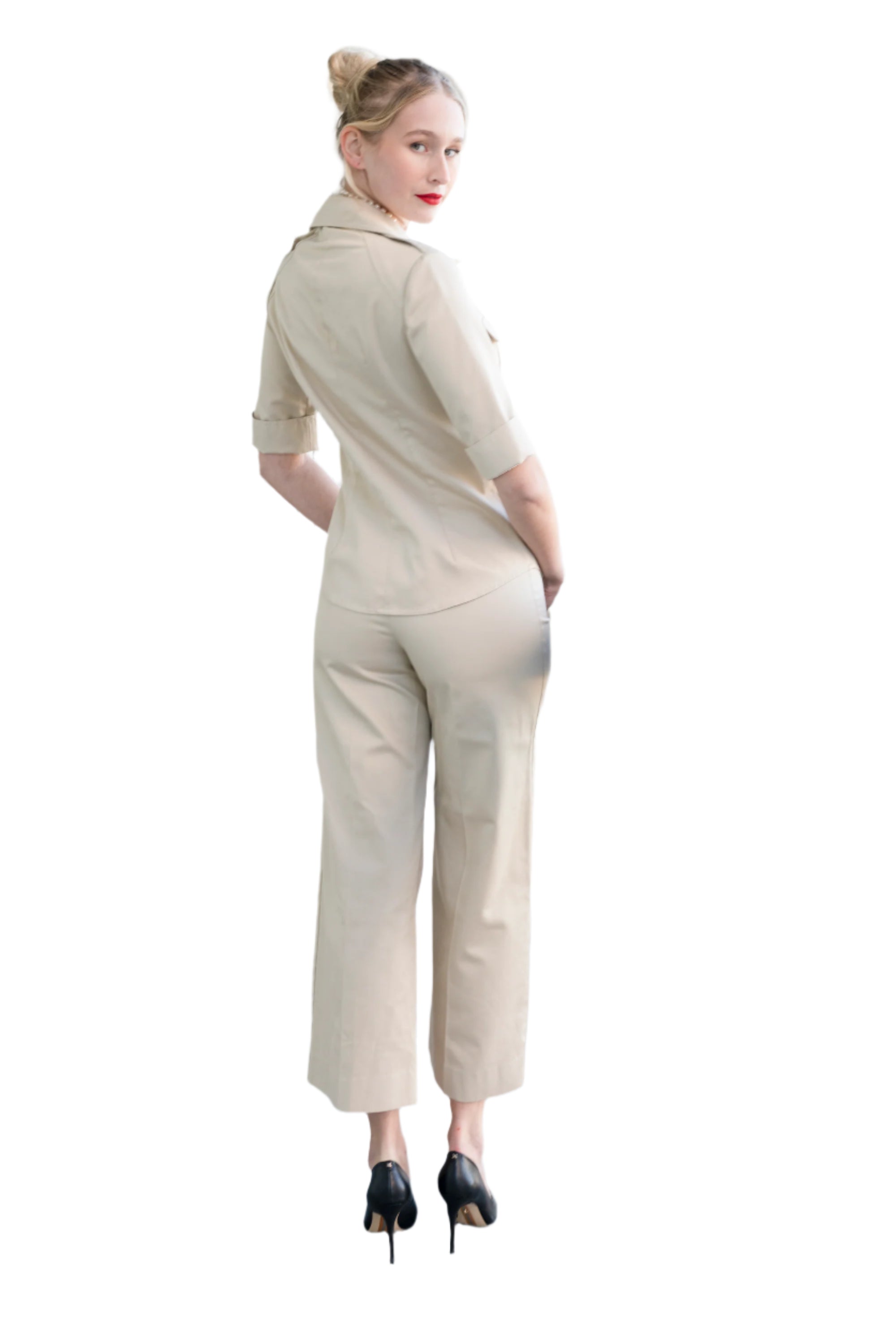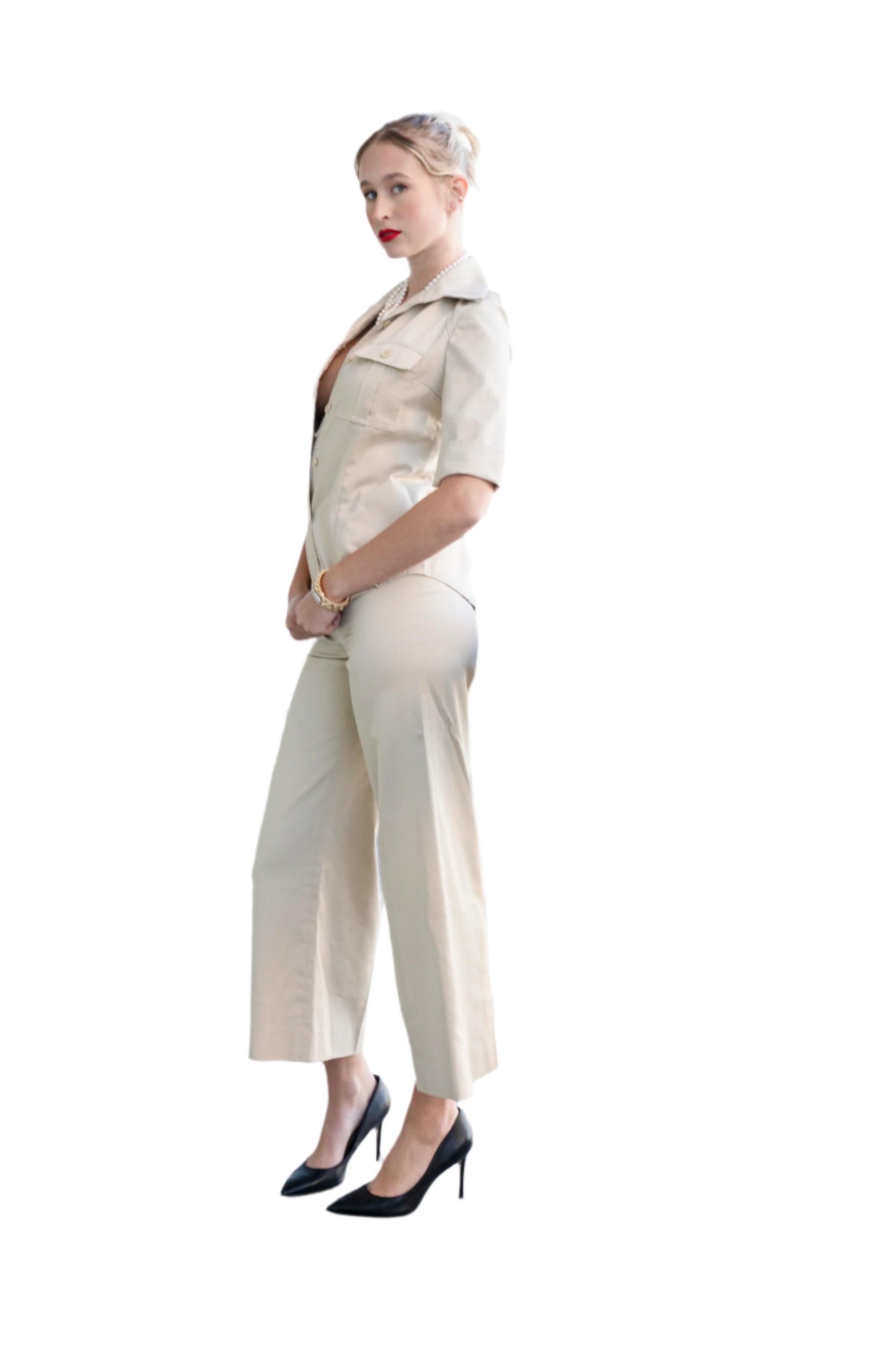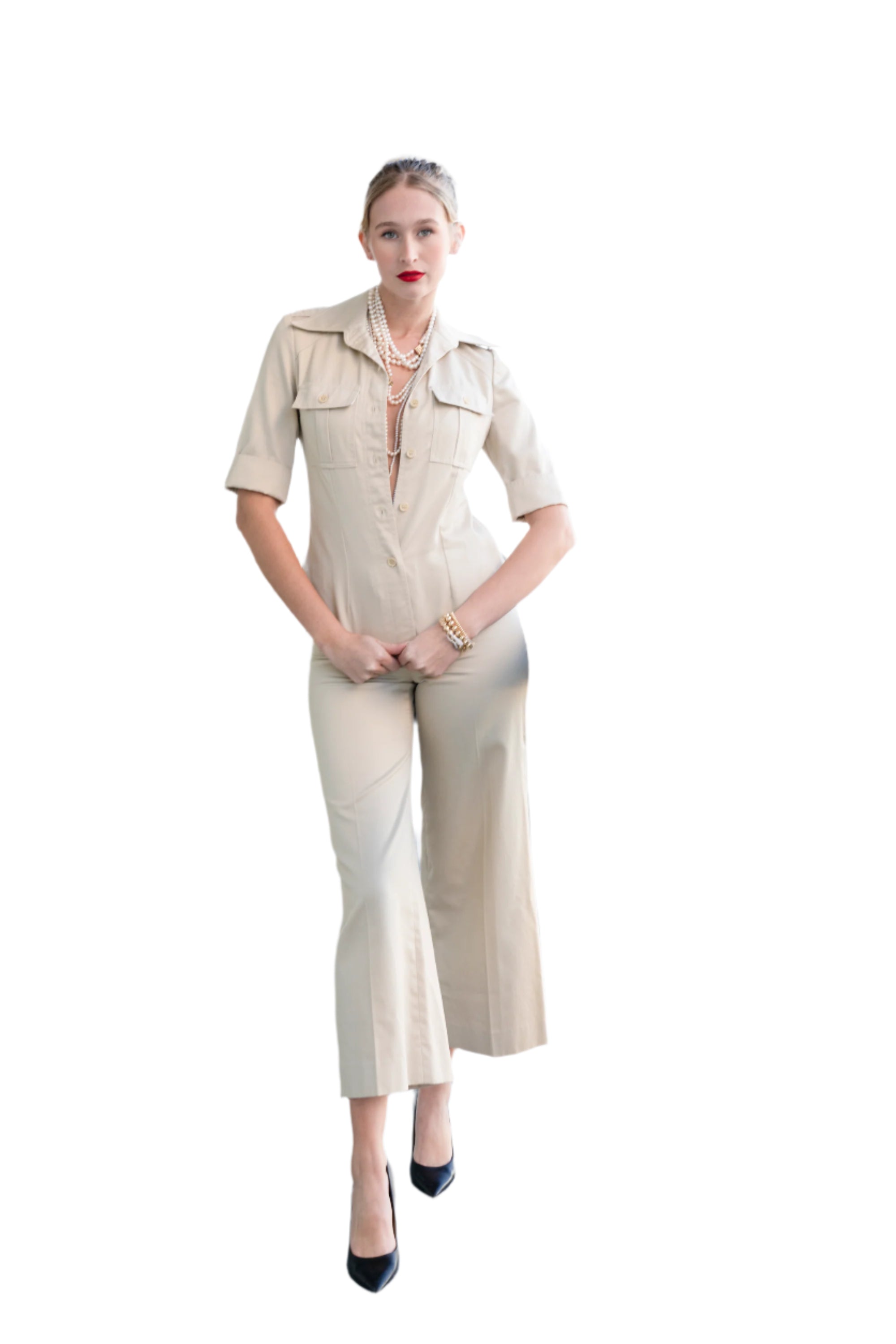 Step back in time with this vintage 1970s Joseph Magnin Khaki Pant Suit. A safari-inspired set that effortlessly combines fashion and convenience. The oversized lapel, breast pockets and cuffed sleeves add unique elements to the button down top, while the button fly pants feature a subtle flare. Versatile and stylish, dress it up or down for any occasion. We couldn't help but style it with layers of vintage pearls.