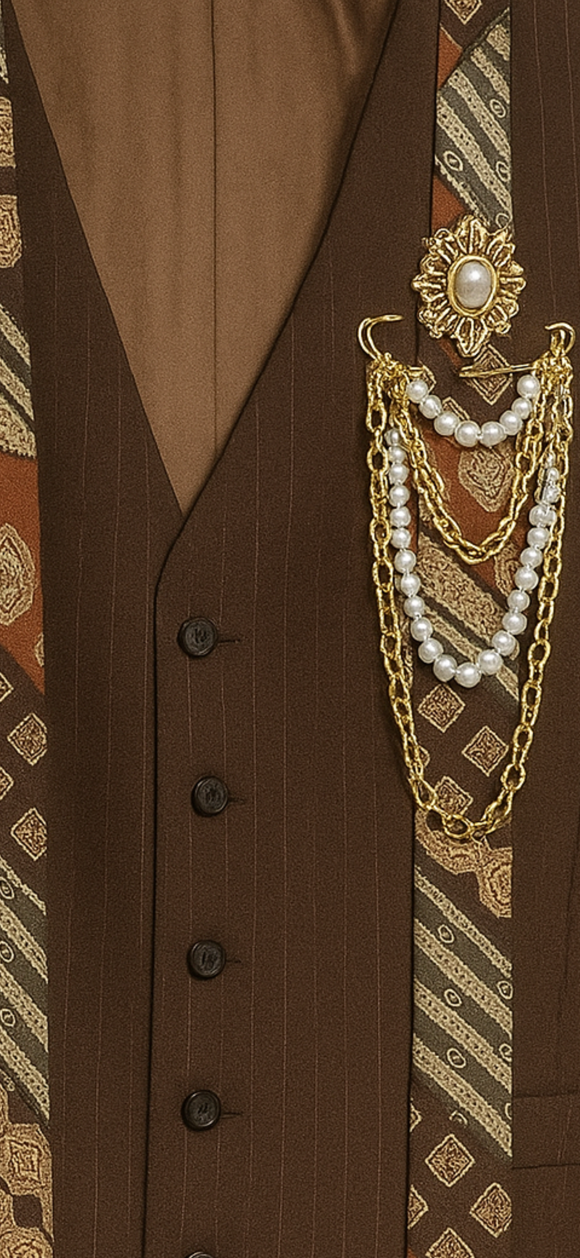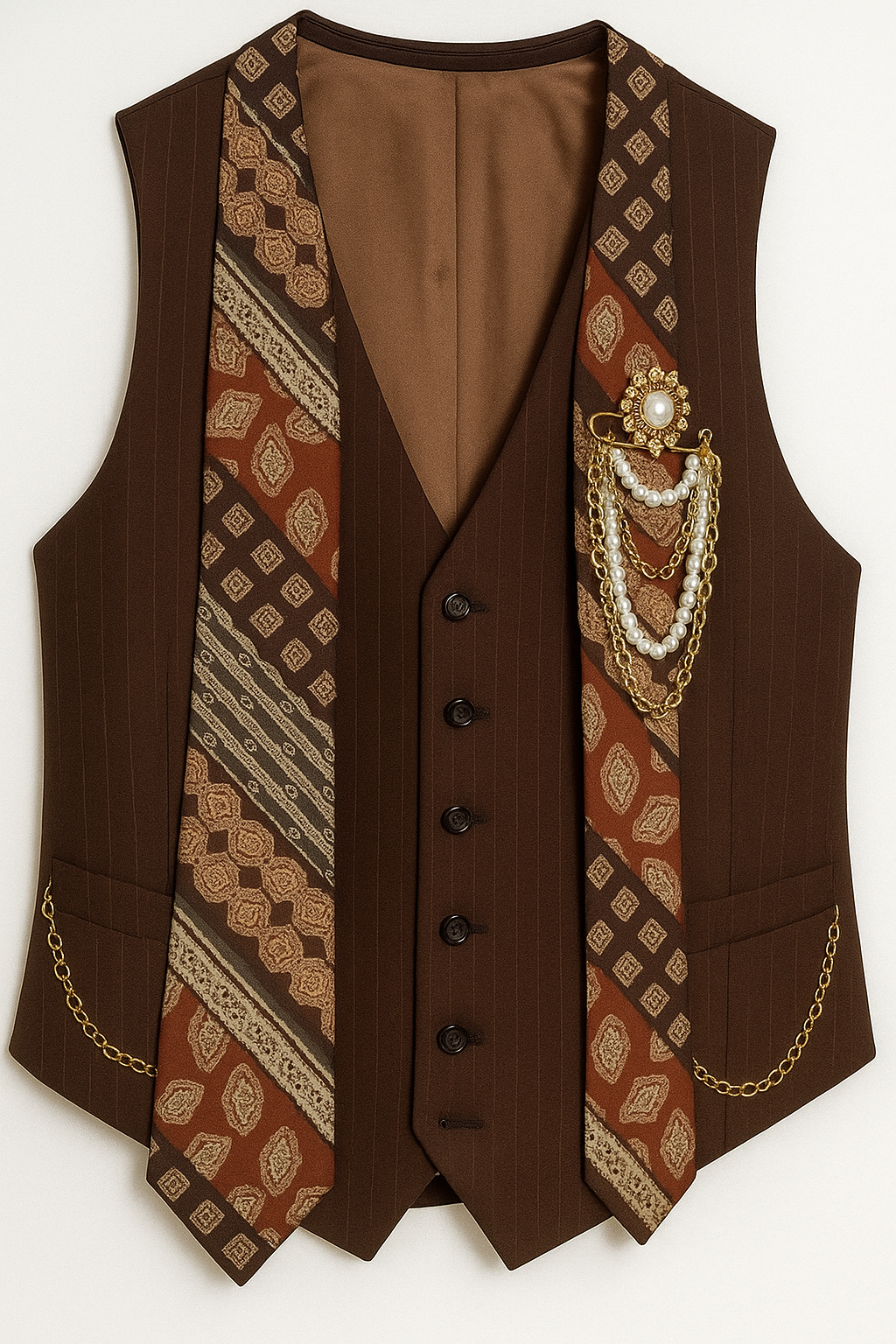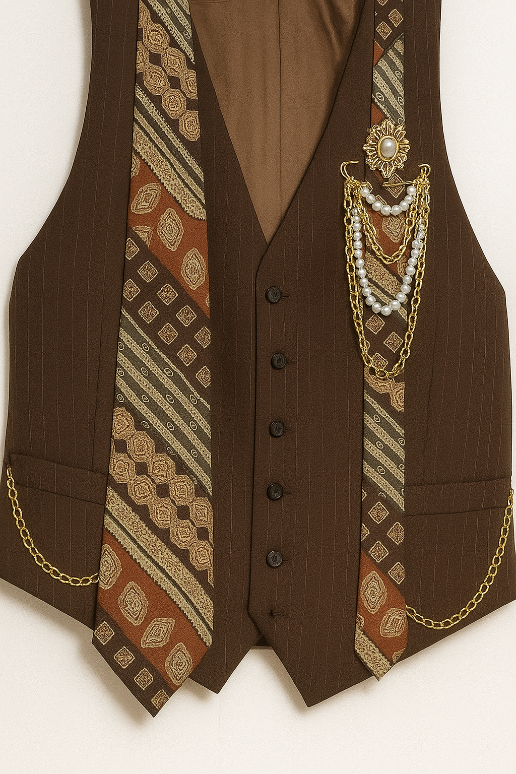 Unleash your inner maverick with this fearless brown pinstripe vest stamped 1978 for John Dimanto, matched with an authentic 1970s Damon Beverly Hills silk tie that refuses to whisper. The accompanying gold brooch, layered chains, and pearl details create an unapologetic vintage power look. For the daring dresser who thrives on turning heads and breaking fashion rules—this curated collection is your ticket to retro rebellion.