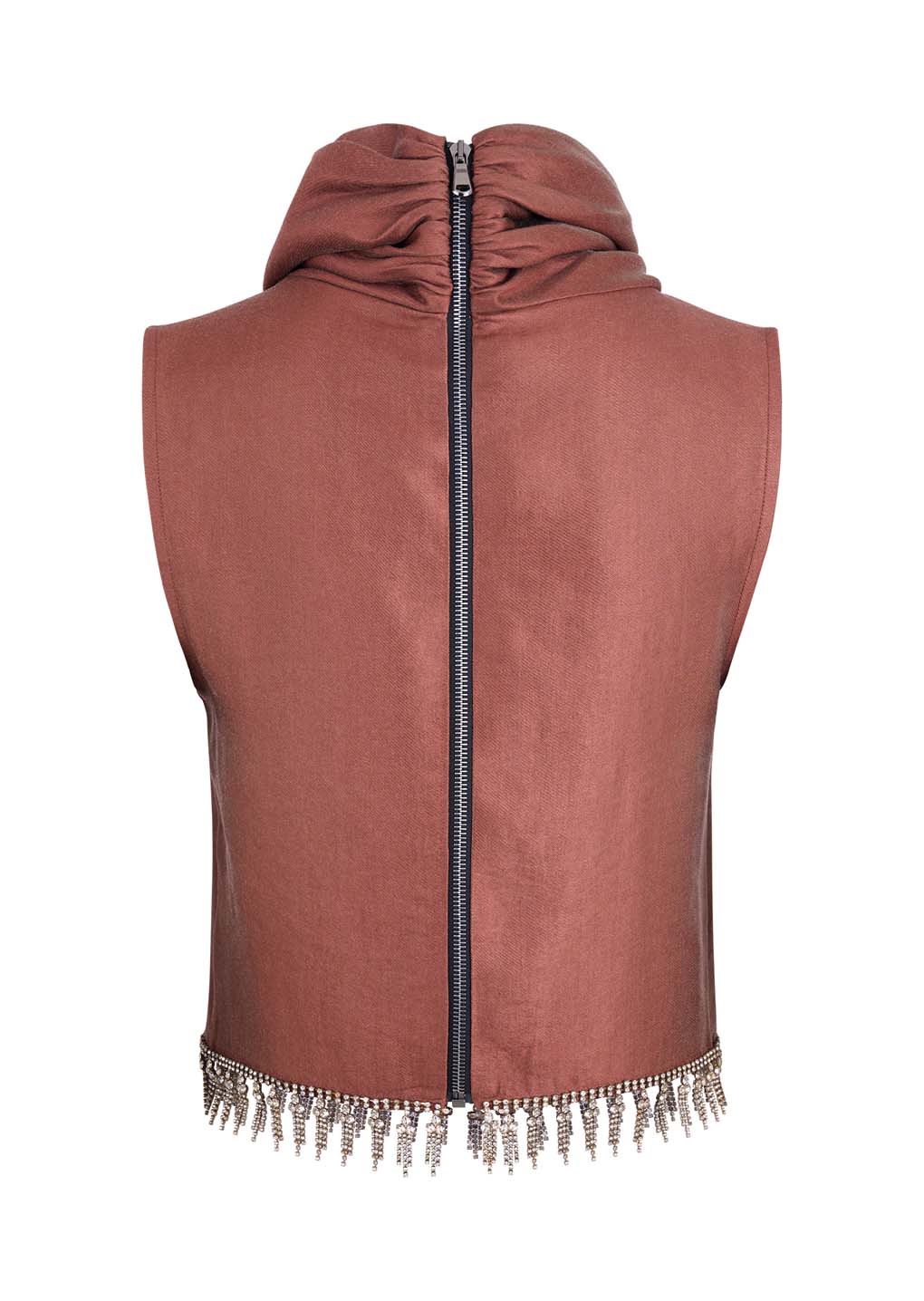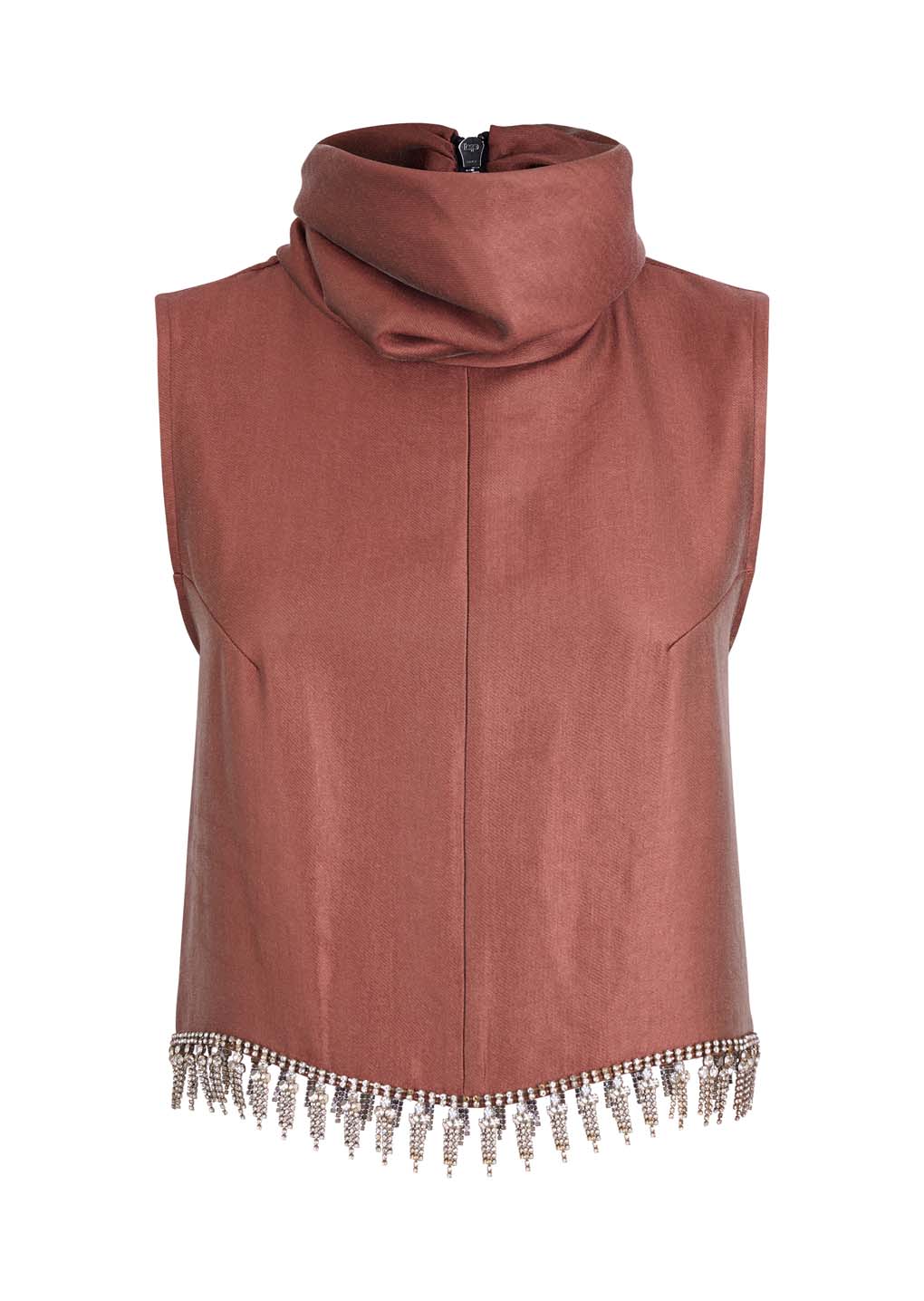 Elevate your basics with a touch of glamour! Introducing the Level Top, a sleeveless piece with a high neck and rhinestone detailing. This top is the epitome of understated elegance and everyday luxury. Styled with the Ladon Pant or Martha Skirt.