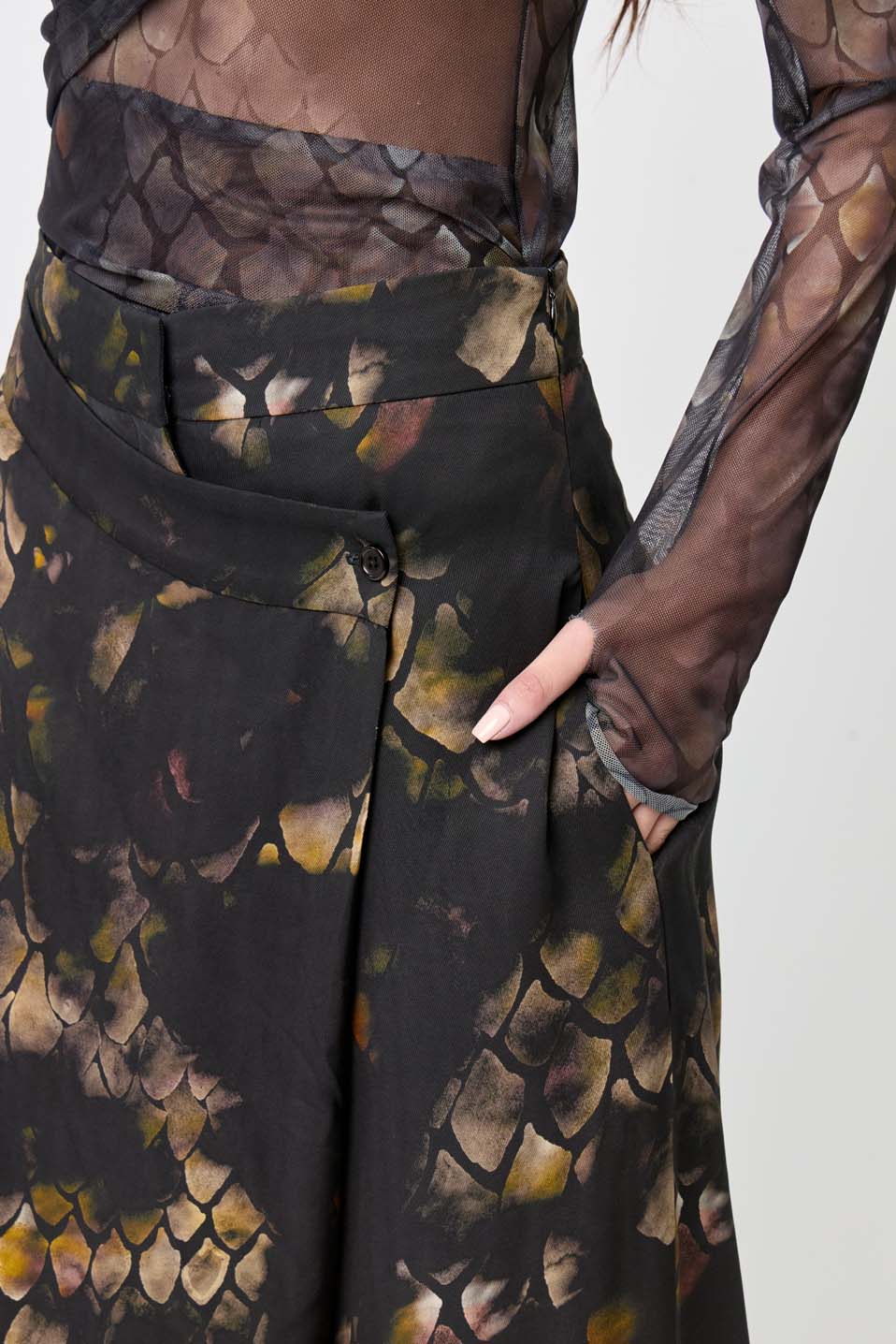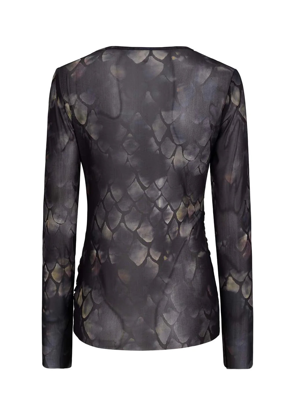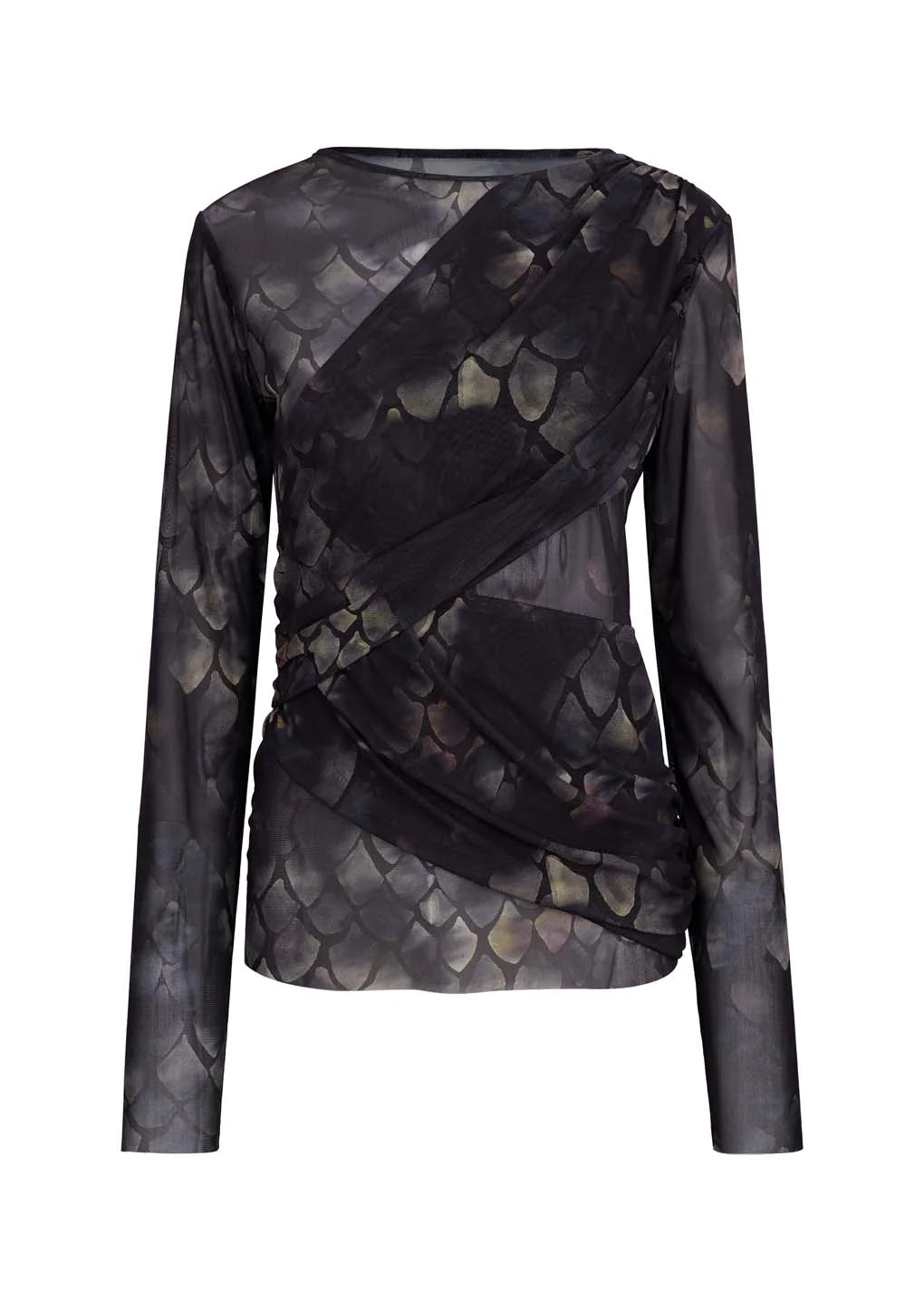 Introducing the Niho top, a mesh fitted shirt with sleek pleated details and a unique broken scales print. The mesh fabric offers a modern, breathable feel, while the pleated details add a subtle touch of sophistication. Pair it with the Scale Pant for a striking look.