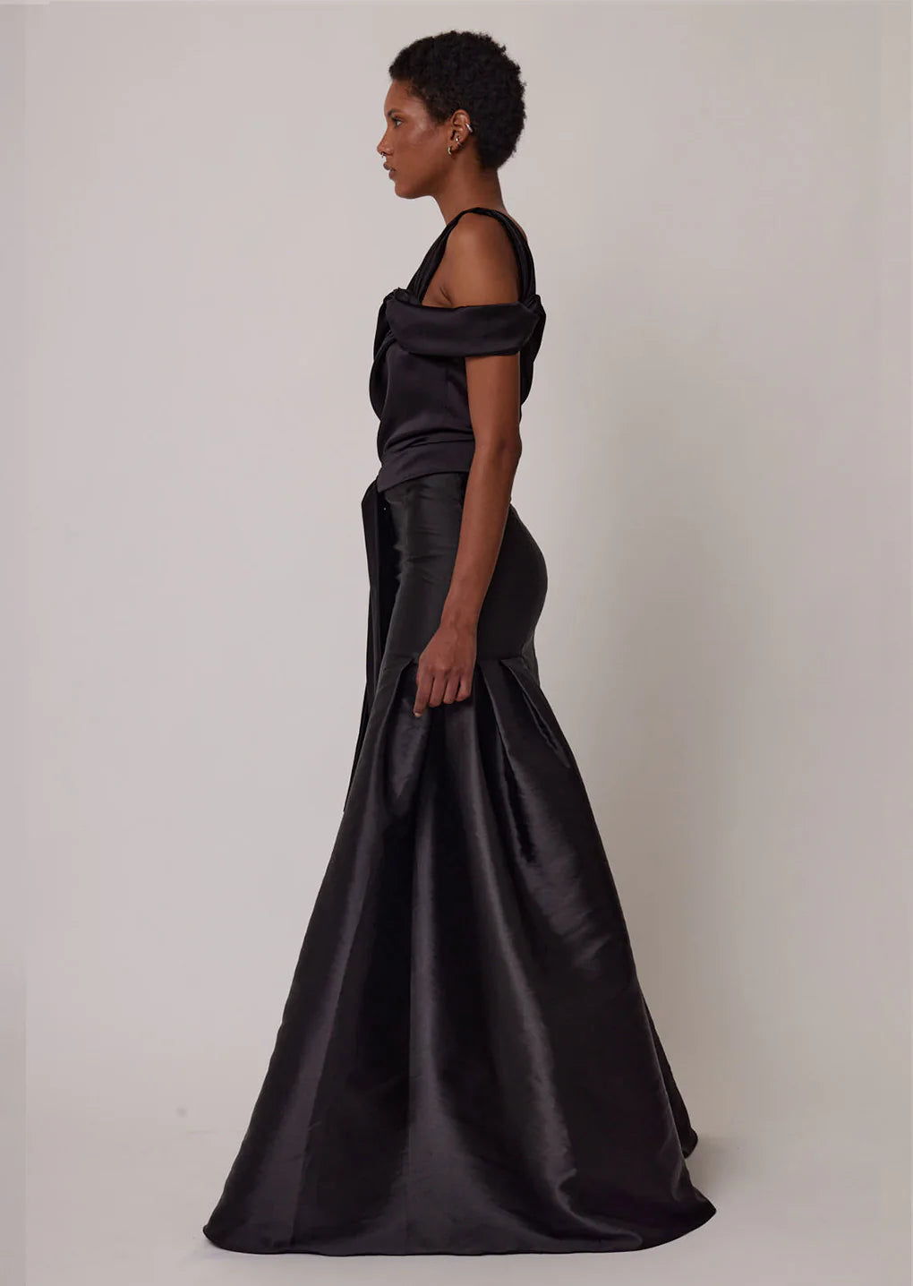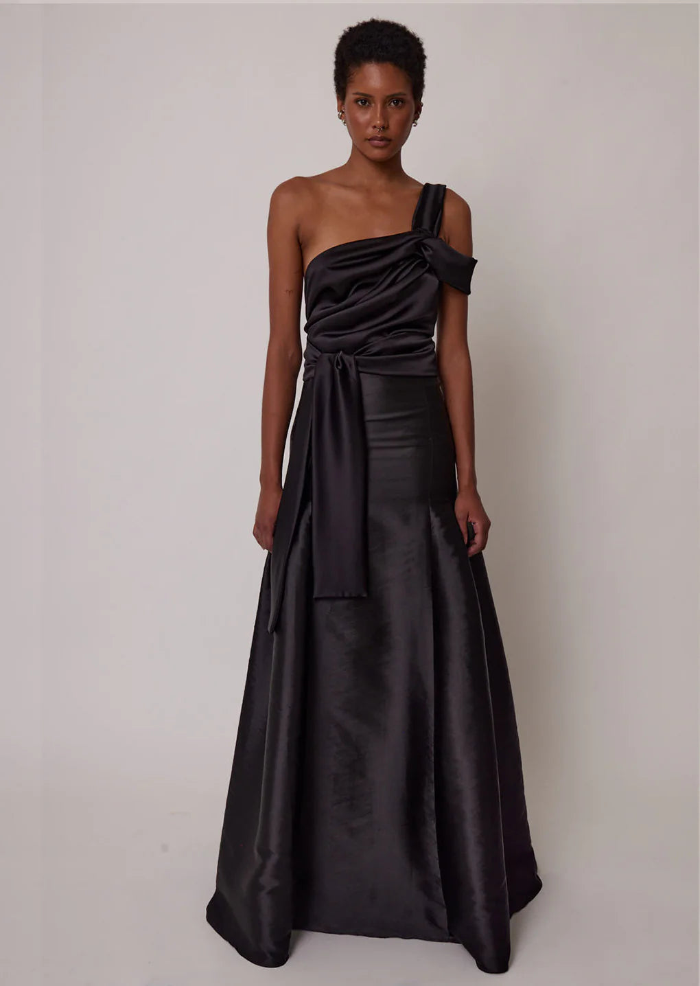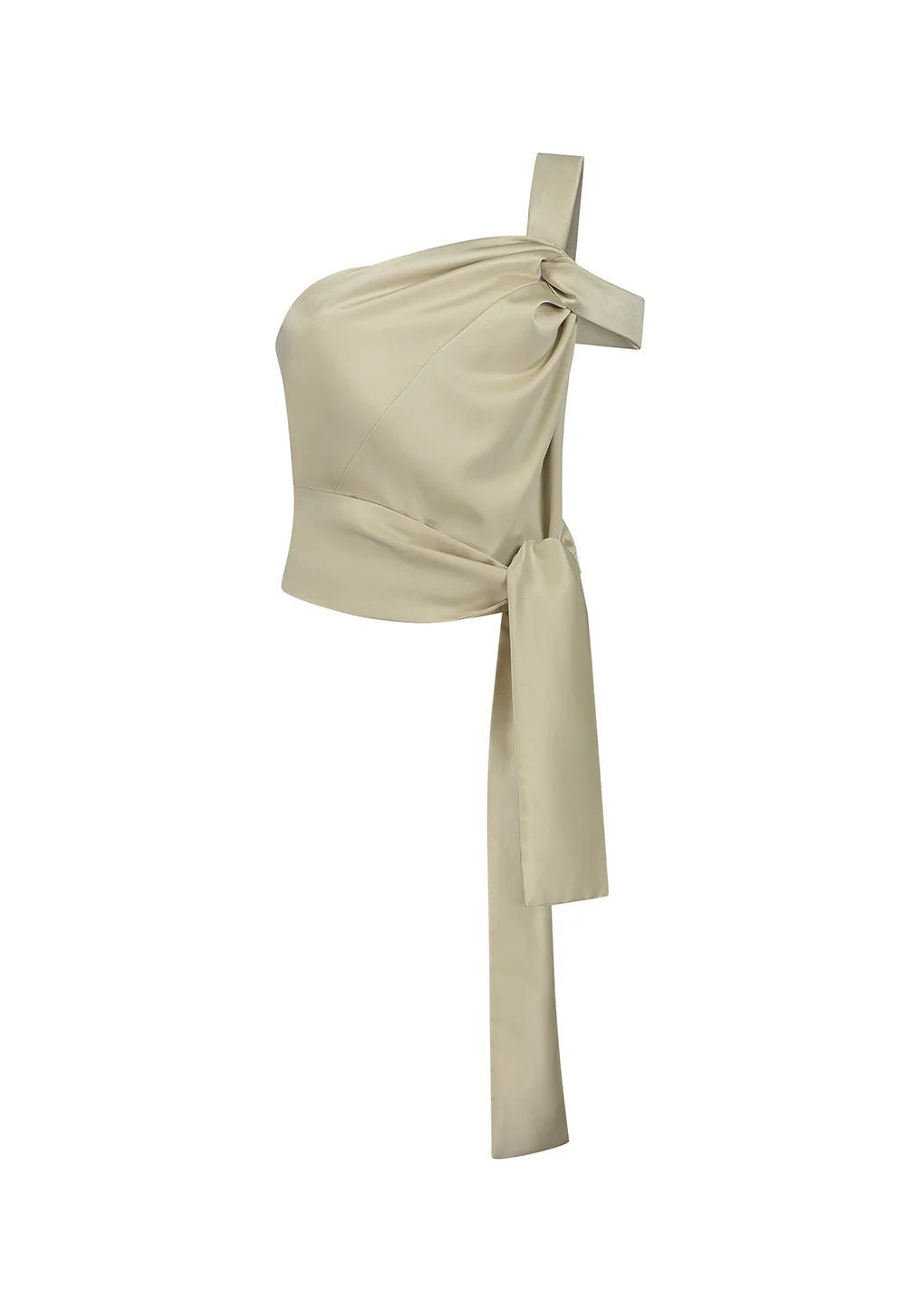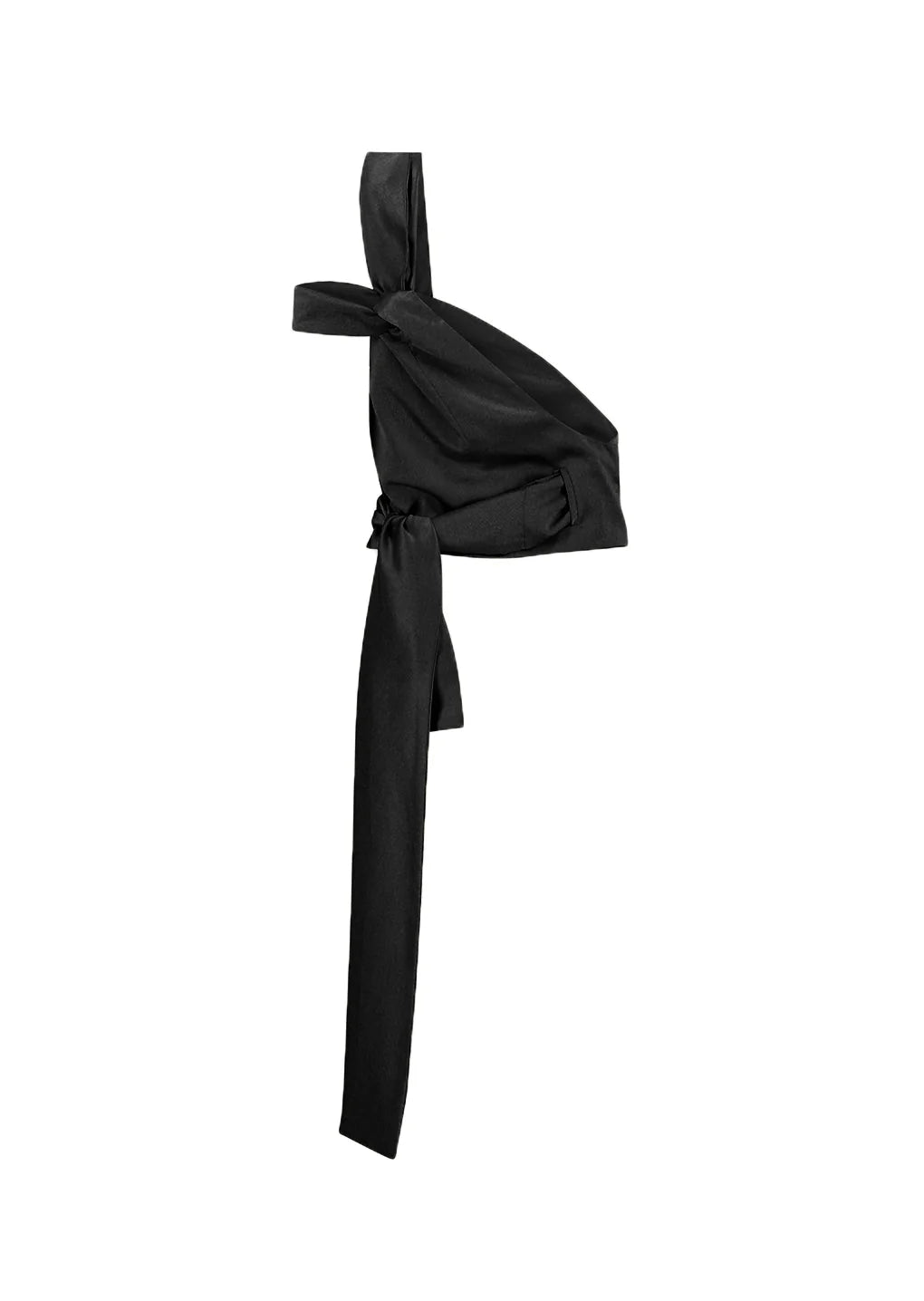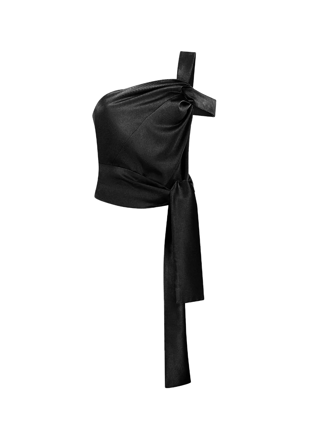 This one-shoulder wrapped-around top in black statin or ivory satin combines an effortless yet chic design. It's an essential timeless piece that will add sophistication to any of your looks. Dress it up for a special occasion skirt or tone it down with denim pieces.